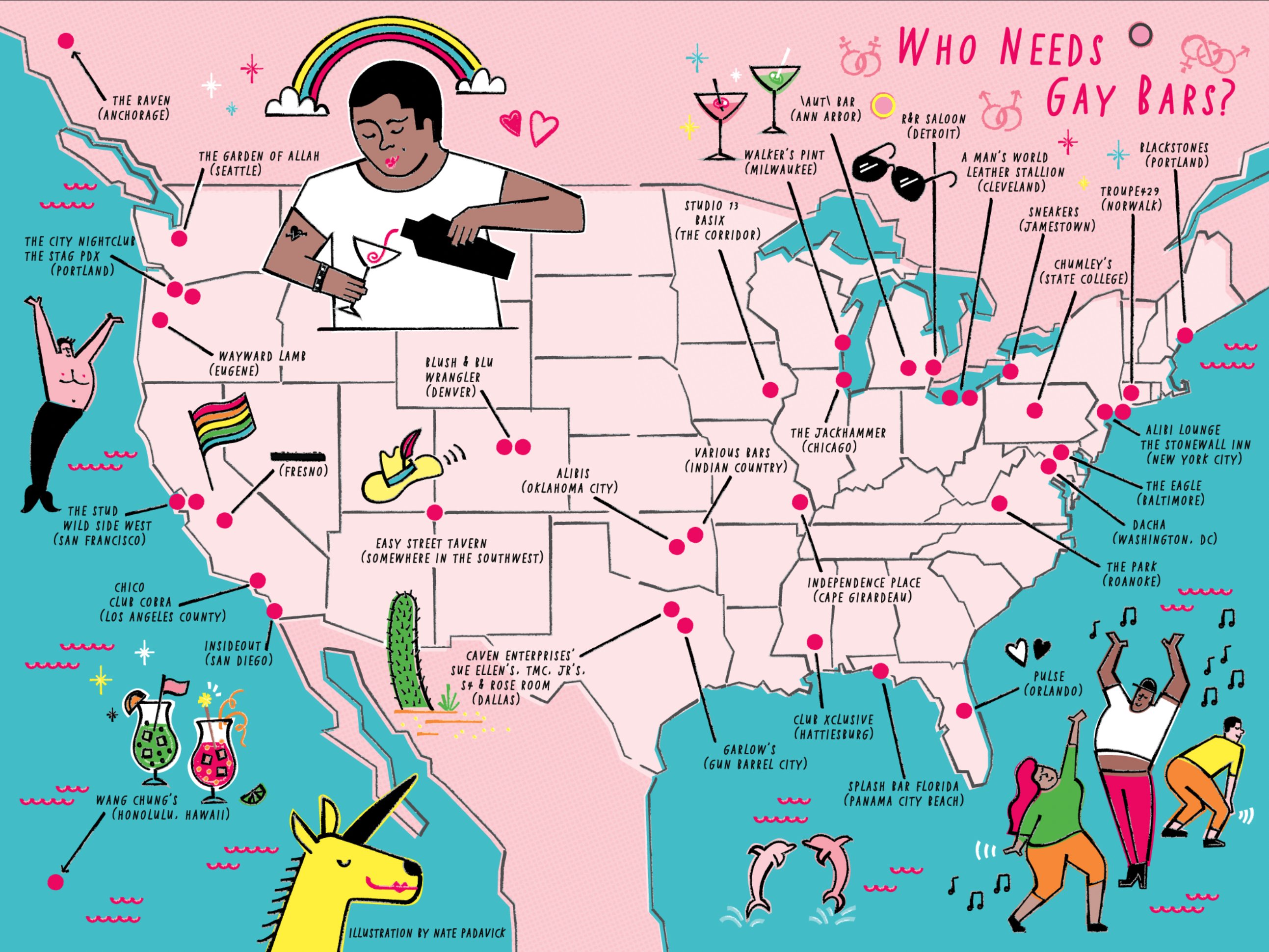 GM: I wanted to visit I had wanted to visit the bar in Vermont and I got to go last month so I have a little piece that I’m trying to place about the Fox Market and Bar in East Montpelier, Vermont. As far as I know, it’s the only gay bar and grocery store that exists in the country. So, you can go to queer speed dating and buy organic sweet potatoes and cheese. And it’s in a very small town in fact, it’s the only bar in that town so if you wanna drink in East Montpelier, you have to go to the gay bar or you got to drive to the next town over. I had wanted to go to it’s called Charley’s in Pocatello, Idaho because it’s one of the most remote gay bars in the country in terms of driving distance from other gay bars. I wanted to go to Salt Lake City to go see the gay bars there and I had wanted to go to Puerto Rico to include it as part of these United States and its Commonwealth territories but at a certain point, you know, I made it to Hawaii, I made it to Alaska. And at a certain point, my partner was like when is this ever going to be done like isn’t 300 enough? And so really, he helped me realize that I had more than enough to sit down and write the book.