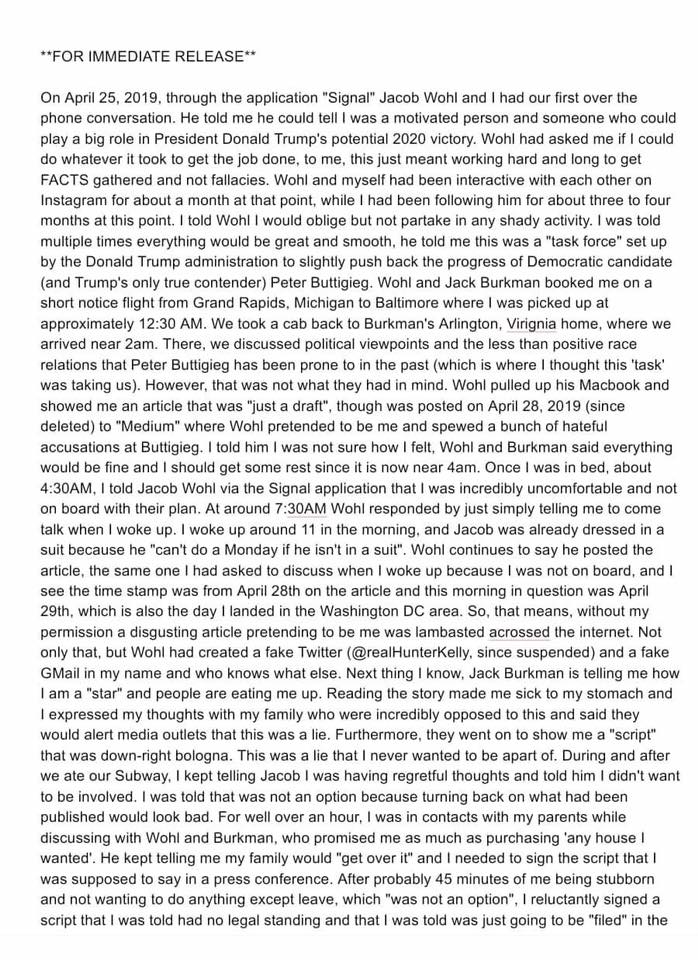 According to a statement posted on his Facebook, Kelly says the two revealed a “draft” of an article that was to be posted on Medium accusing Buttigieg of sexually assaulting Kelly. Kelly says he wasn’t feeling comfortable about the idea, but Wohl told him to sleep on it as they had talked until about 4am.