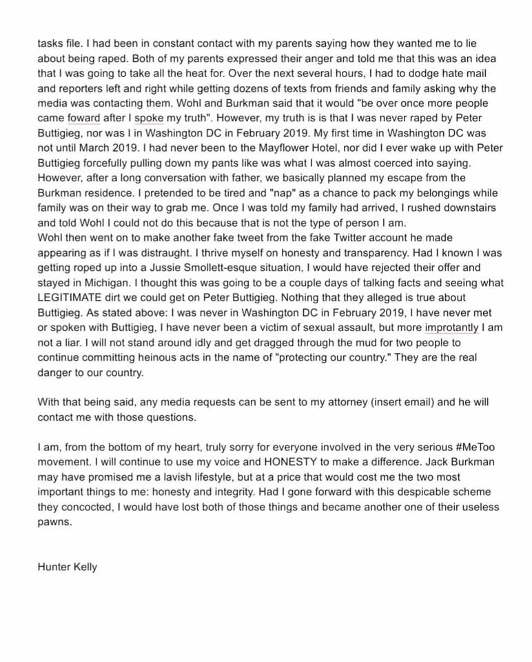 Burkman posted a copy of the signed ‘script’ along with a photo of Kelly holding his ID with the caption, “1. Very first thing Hunter Kelly did is sign a statement attesting to his accusation 2. He was in full control of all public disclosures, even taking a selfie with his ID to confirm his identity to @MediumSupport MSM bullied him & his family into submission”