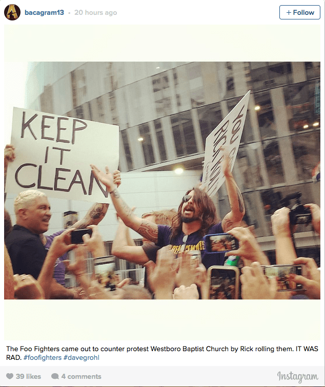 The always-awesome Foo Fighters are no stranger to taking the notoriously homophobic Westboro Baptist Church to task, but they may have topped themselves this time: Buzzfeed reports that Dave Grohl and Co. rickrolled the religious organization, which was protesting their Kansas City, Missouri show on Friday night, by cramming into the back of a pickup truck and blasting Rick Astley’s “Never Gonna Give You Up.” Watch the whole glorious episode here. – spin.com