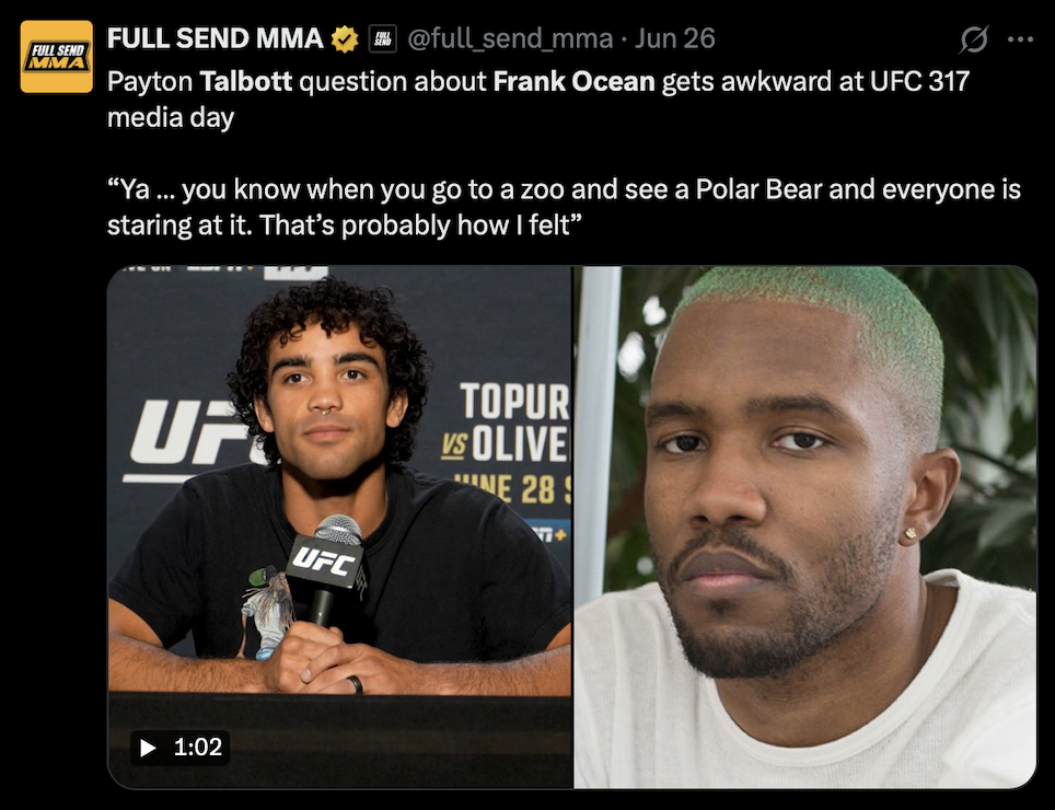 Frank Ocean is no stranger to dropping breadcrumbs that send fans spiraling—and this time, the trail leads straight to a UFC octagon. Back in August 2024, Ocean shared a casual photo of him dining with UFC fighter Payton Talbott, sparking a flurry of online speculation. Since then, he’s posted moments from Talbott’s fights and even featured him in a Valentine’s Day Instagram story. Naturally, the internet did what it does best: ask, “Wait, are they…?”