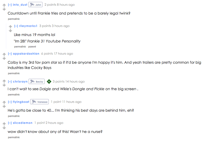 At least the Big Brother contestants who do gay porn stand by it & use their real names. If all these other guys were so proud, they'd use their real names too. After all, just a little Google sleuthing reveals it. Reading subsequent issues from him on this project makes me laugh. Cockyboys owner/directors have this attitude that they're these revolutionary film makers. Interviews often get so philosophical. What I find intersting is the large percentage of Cockyboys fans/members are straight women. Cosmo just did an article on it, saying 30% of paid members. I don't know how they'd know that from a credit card but looking on Twitter, the overwhelming majority of comments & fan accounts are women. They apparently just had a fan gathering Cockycon in Chicago and looking at the photos posted, it seems like 80% of attendees are women. Hey cash is cash and they seem to be making a lot of money. I'm just wondering if they're making gay porn for gay men anymore or is it romance novels for women?