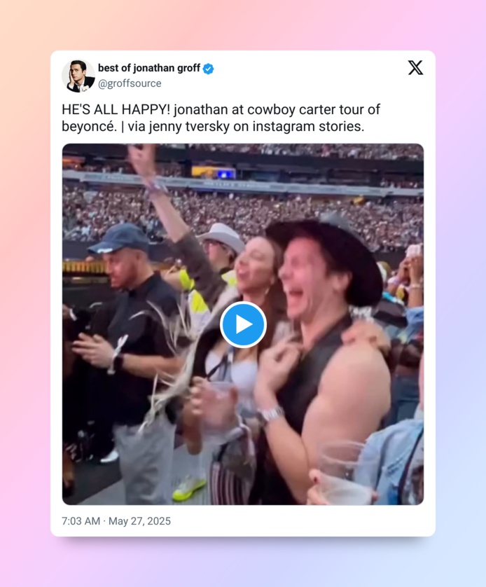 Oh, and for the record—yes, Groff is gay. He came out publicly in 2009 and has since become a beloved figure in the queer community, not only for his career-defining roles (Glee, Looking, Hamilton) but for moments like this one: proudly strutting into a Beyoncé concert in full leather, cheeks out, joy dialed to eleven.