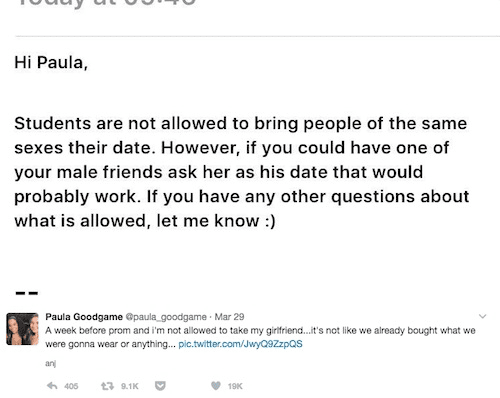 And the law has limited reach. Fricke v. Lynch currently only applies to public schools. Private, religious schools don't have to follow all the same guidelines that public schools do, including sex-based Title IX requirements. At St. Petersburg Catholic High School in April, 17-year-old Paula Goodgame was told she couldn't bring her girlfriend to prom. After reaching out to her guidance counselor, she received this answer in response:
