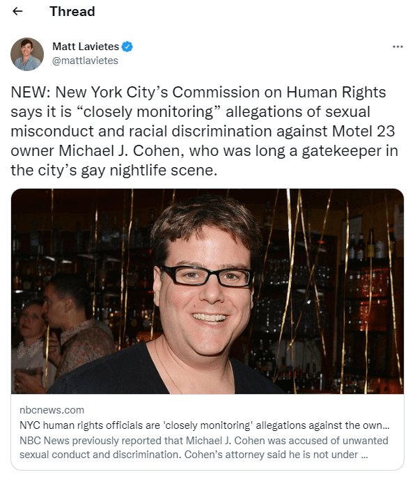 Karma’s a bitch. And she always shows up. Even for former gay nightlife kingpin Michael J. Cohen. NBC News just reported that Cohen, owner of the now-closed bar Motel 23, is being investigated for unwanted sexual conduct and discrimination. Motel 23, located in Chelsea, has long been rumored to treat minorities differently, and not in a good way, than their white counterparts. There is even an Instagram account specifically for customers to relay their tales of horrible treatment. (Dude when there is an Instagram account with 1,800 followers and almost 100 posts you might need to look at your life and the choices you are making, just saying…)