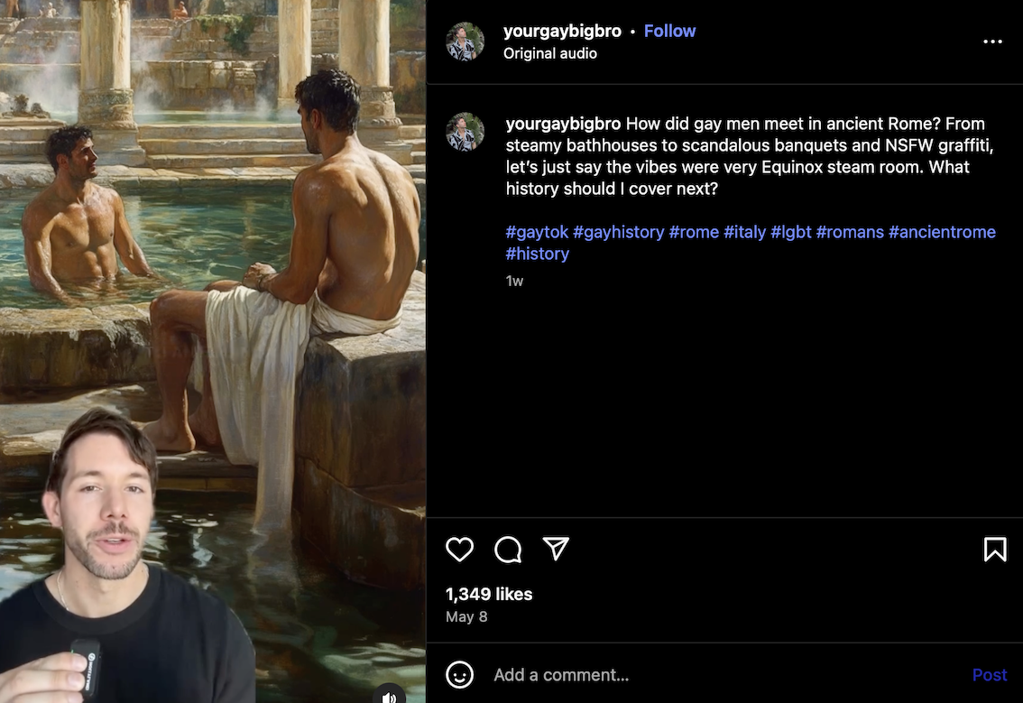 If you thought the gays invented cruising culture in the 21st century, think again. Thanks to @yourgaybigbro (aka Chase Finn), we’ve all been blessed with a steamy little history lesson about how Romans met in Ancient Rome—and let’s just say, bathhouses and beautiful men were definitely involved.