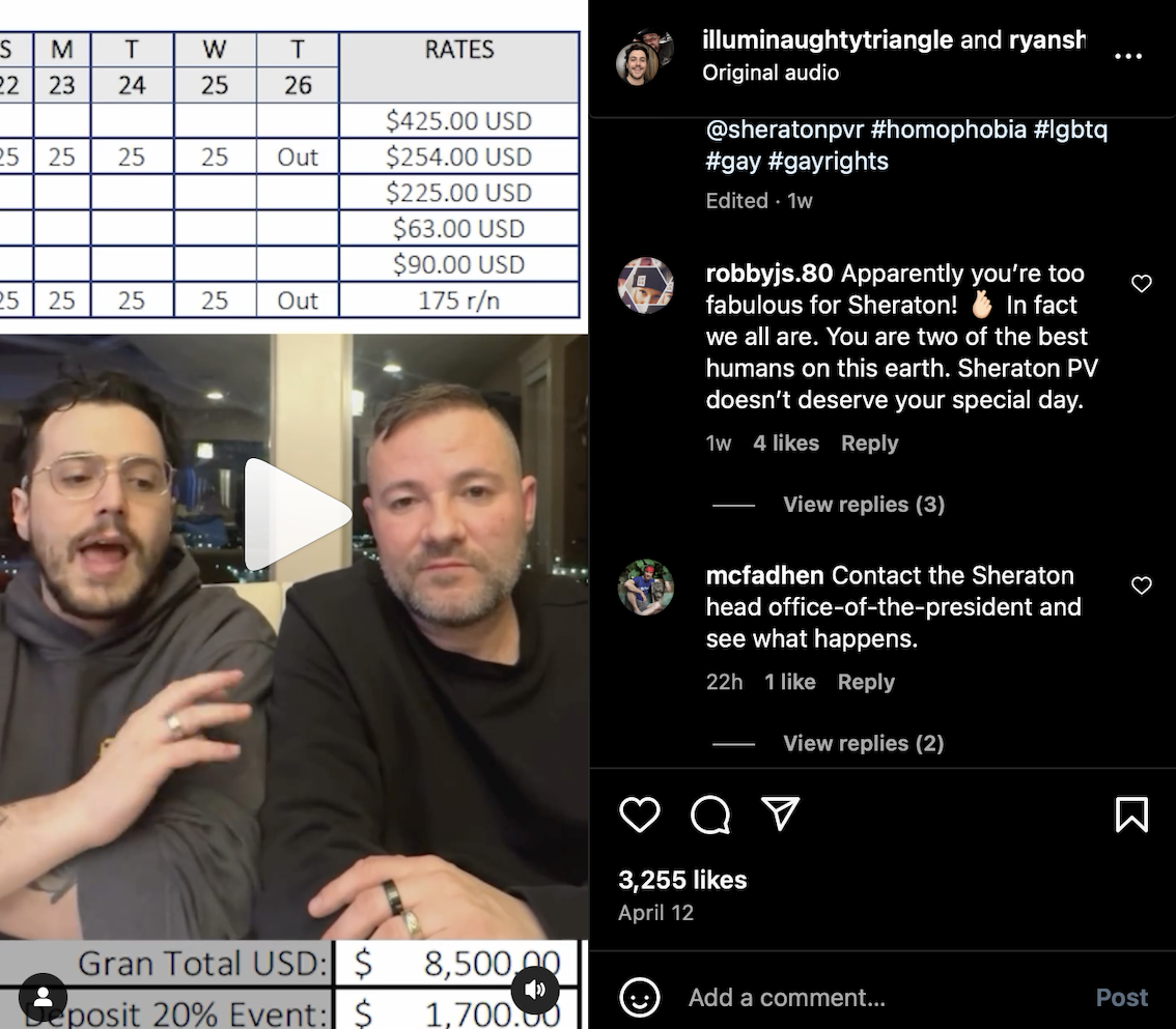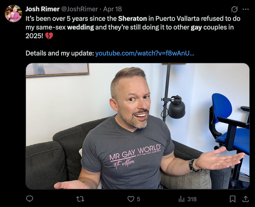 “Soooo disappointed that my fiancée and I got discriminated against for our wedding plans in Puerto Vallarta by #Sheraton!! Worst of all, they’ve probably done this to countless other same-sex couples.”