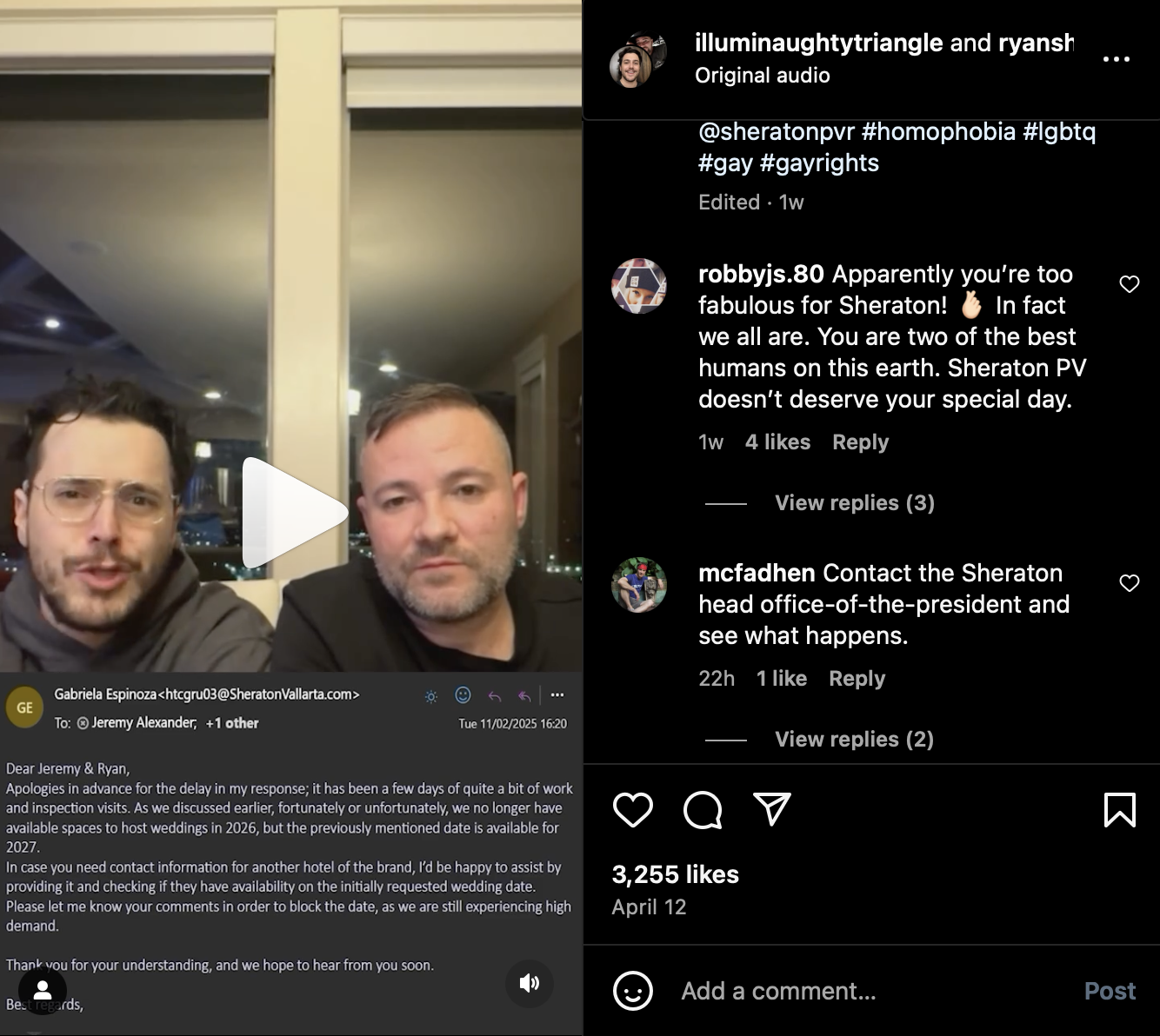 For many members of the LGBTQ+ community, especially those planning weddings, this situation has stirred concern. Puerto Vallarta is widely recognized as one of the most LGBTQ+-friendly destinations in Mexico, known for its Pride celebrations, inclusive nightlife, and welcoming resorts. But this incident raises important questions: Are businesses truly treating LGBTQ+ clients equally behind the scenes? And are franchise-based hospitality brands doing enough to ensure consistency in inclusive practices?