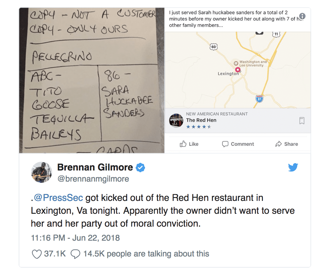 Wilkinson huddled with the Red Hen’s staff and asked for their input. She told the Post that many of the employees of the Hen are gay, and were uncomfortable serving a woman who has supported the Trump administration’s attempt to ban transgender people from serving in the military, business that refuse service to the LGBT community like Masterpiece Cakeshop, and the separation of migrant families from their children.