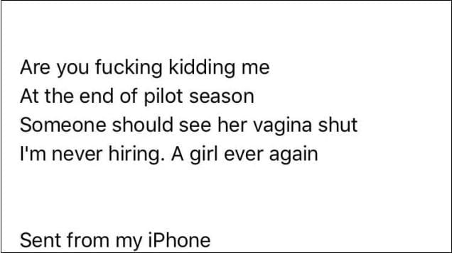 "Are you f****** kidding me at the end of pilot season someone should [sew] her vagina shut I'm never hiring. a girl again"