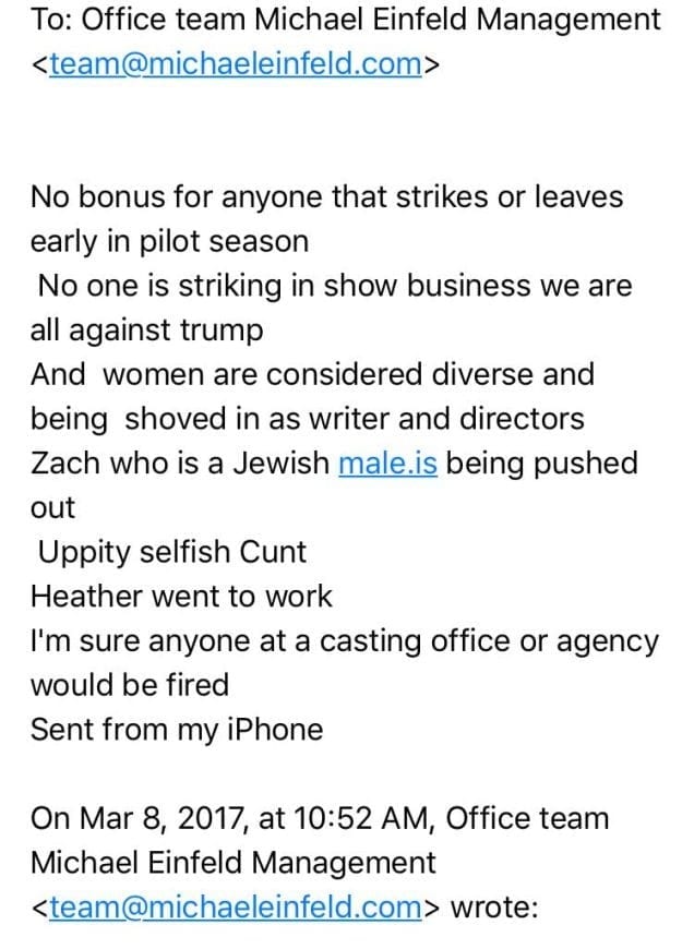 According to a Facebook Post by Rosette Laursen, a former Hollywood-Executive Assistant, tried to request off work on March 8th. Her former boss, the openly gay, Jewish, Talent Manager, Michael Einfeld, wasn't thrilled with her supposed strike. He reacted to her plea as most Hollywood Executives do, in an email. BIG MISTAKE. When will Hollywood learn to stop emailing personal remarks?! The email eventually got sent to Laursen…on accident.
