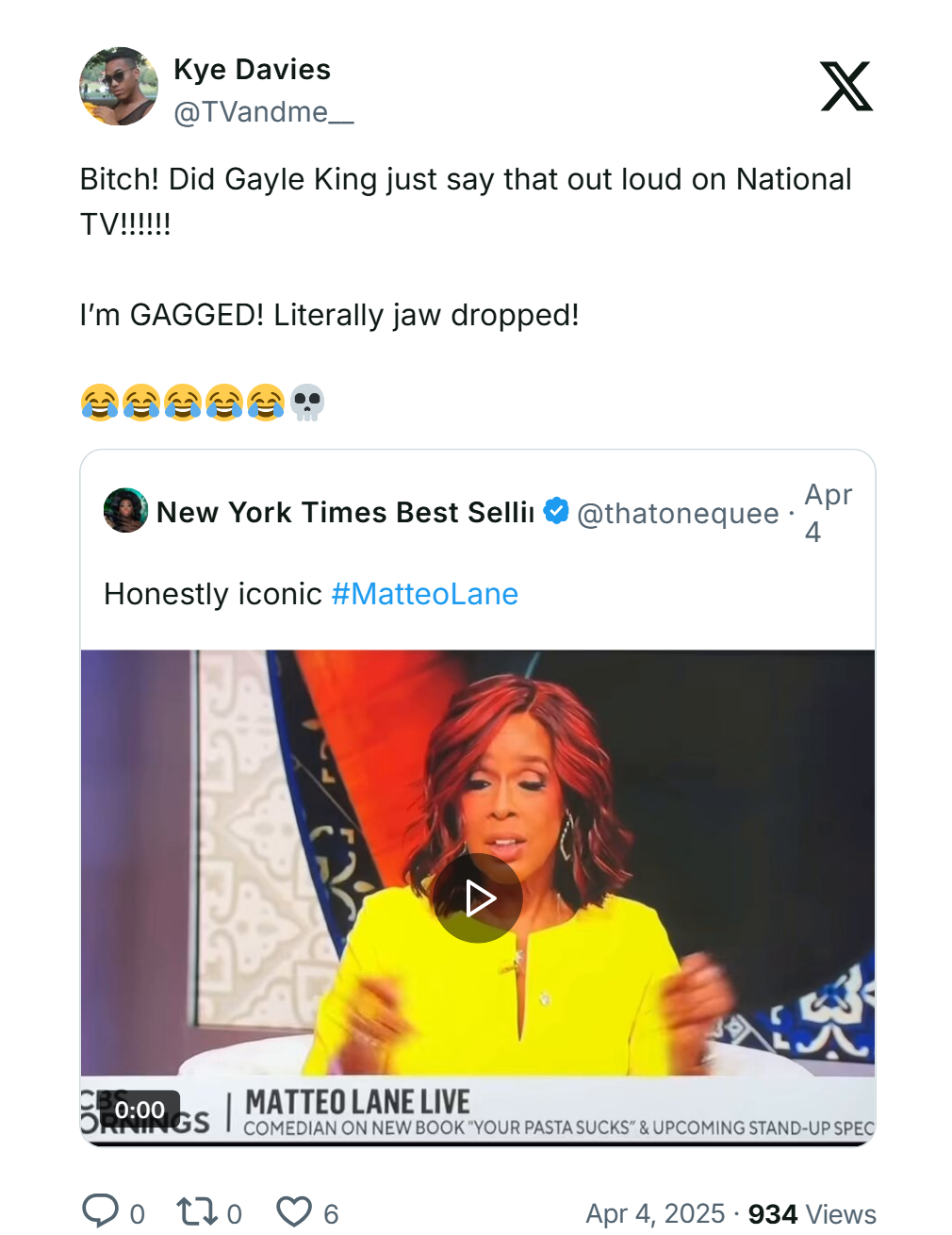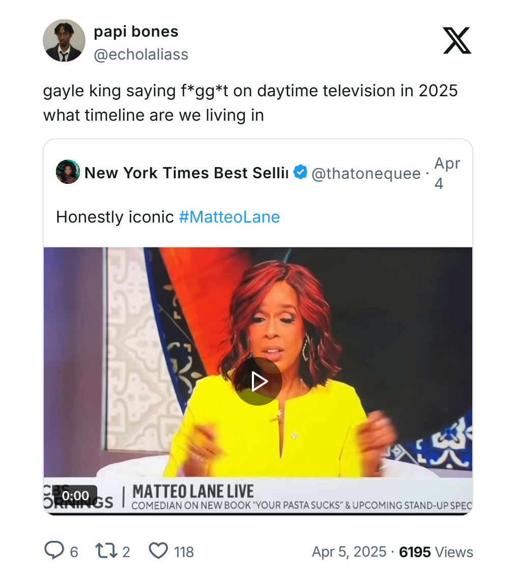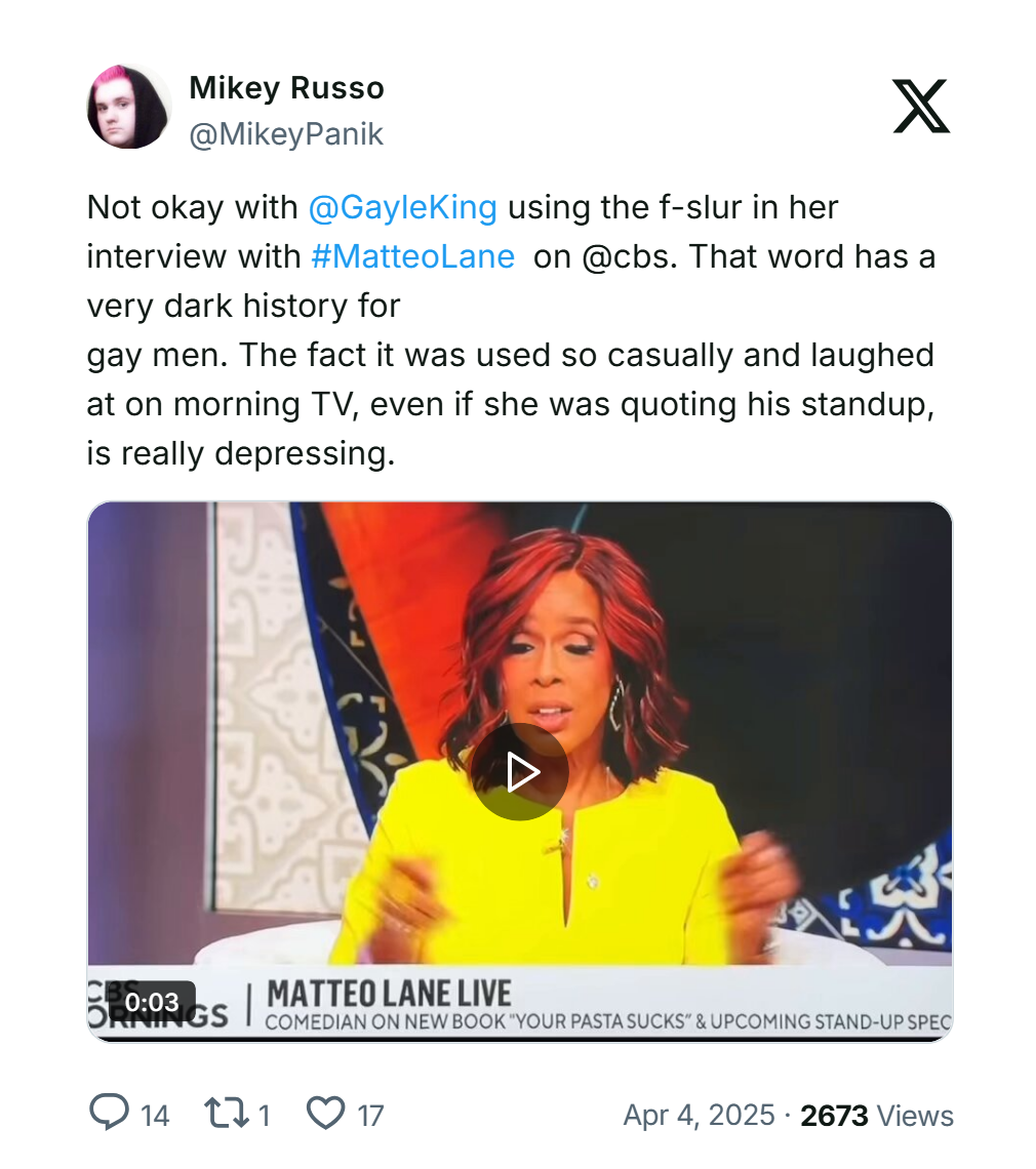 When Gayle King, CBS Mornings’ beloved co-anchor, stepped into the comedy spotlight this past week, she did so with all the finesse of someone who’s been practicing a punchline—or, perhaps more accurately, someone who’s been trying to avoid a punchline. On April 4th, during an interview with comedian Matteo Lane, King decided to retell one of his stand-up jokes with gusto—and, well, it included an uncensored gay slur. Oops?