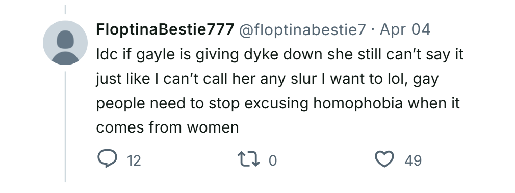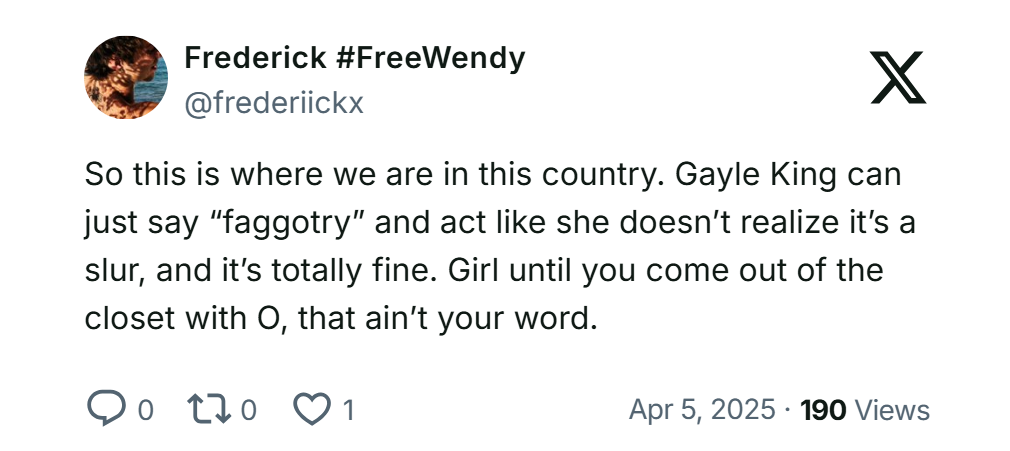 Gayle is an ally and fabulous black woman. She’s earned the privilege to use the word in the context she did. If a white straight uses it maliciously or pejoratively, that’s absolutely unacceptable. That was not at all the case here, so stop pretending that you’re traumatized by the use of the word — we’re not buying your obligatory victim routine. And, NO, it’s not equivalent to the N word — not even close.
