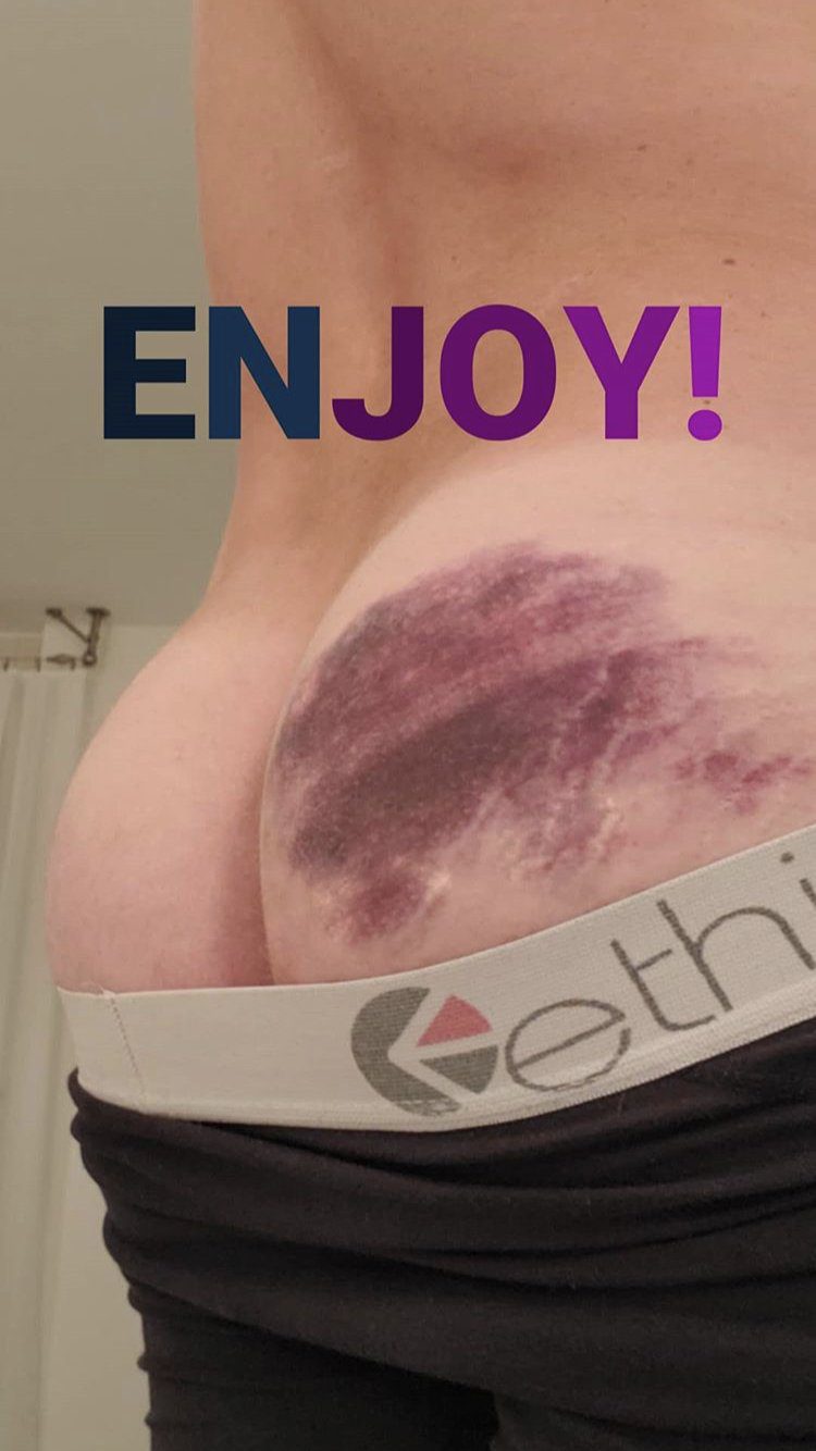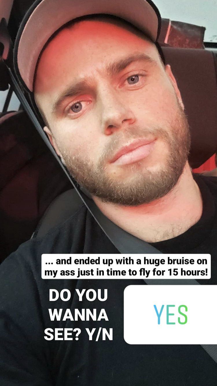 “Ended up with a huge bruise on my ass just in time to fly for 15 hours!” he posted. “Do you wanna see? Y/N”