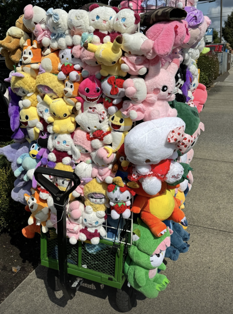 “Basically I saw this [referring to a cart filled with stuffed animals], and was like ‘who is she?!’…so I bought an assortment of stuffed animal keychain babies and I began to attach them to one another to create my ‘animal print vest’.”