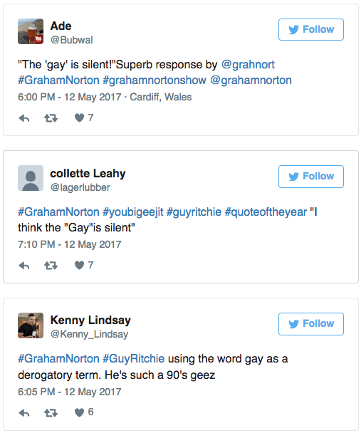 I am Gay, and me and my friends goes to a specific gym where a lot lot lot of gays go, is it a gay gym , no , but it certainly feels like it, some people are a bit to PC, Guy Ritchie certainly did not mean any harm and obviously feels very comfortable around LBTQI people. Just chill people!!!