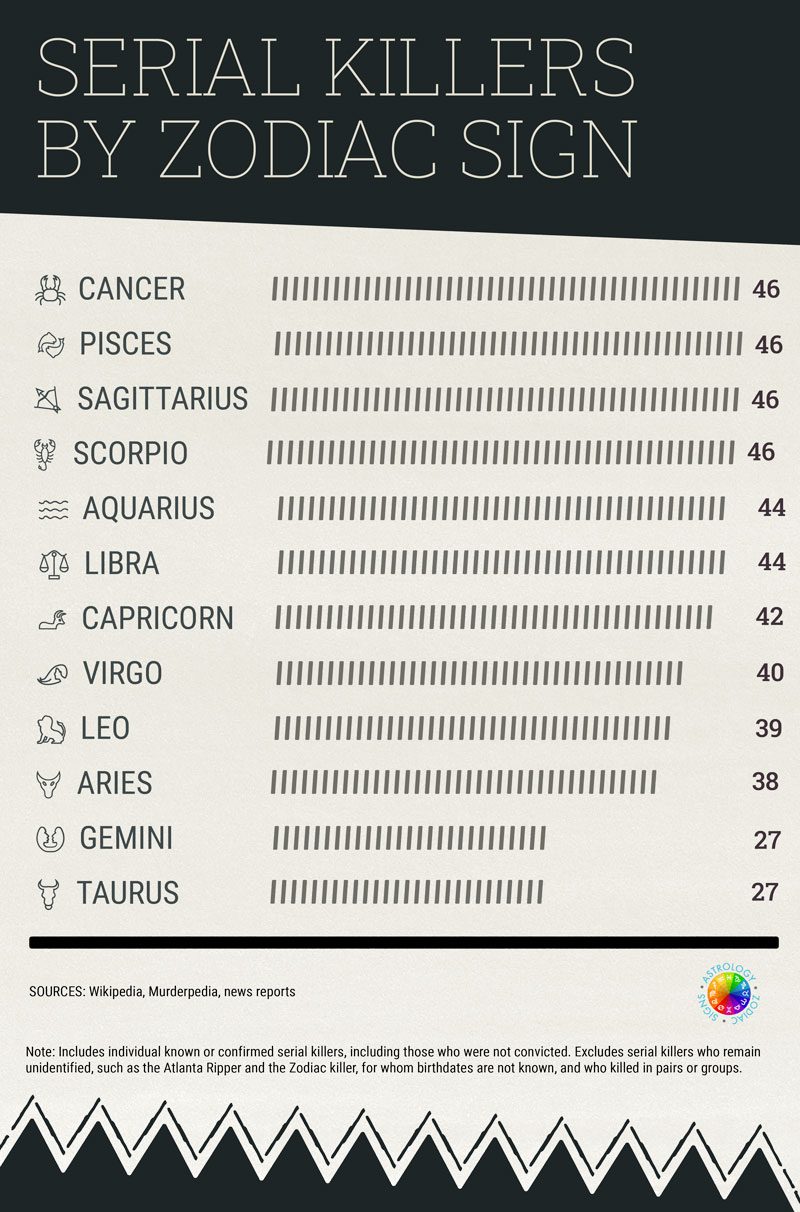 - Cancer, Pisces, Sagittarius, and Scorpio account for almost 40 percent of serial killers. Of the 485 serial murderers included in our analysis, 46 were from each of these signs making them the four most common signs among serial killers. Gemini and Taurus combined account for only 11 percent or tied with 27 each.