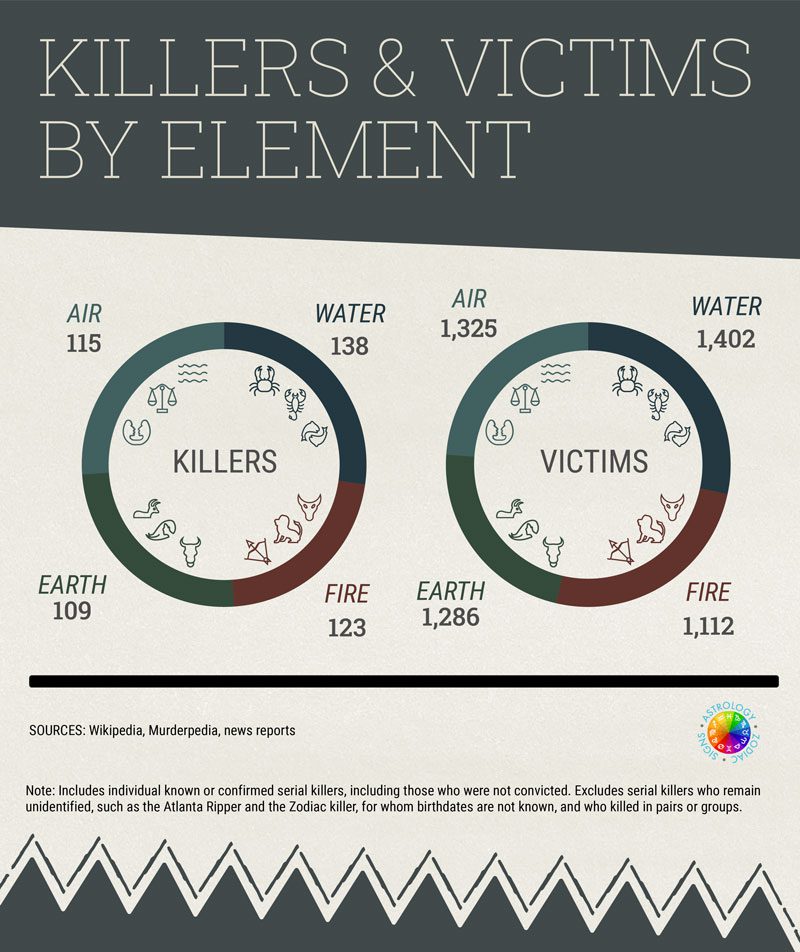- Cancer, Pisces, and Scorpio accounted for the highest number of killers and victims in our analysis — 28 percent of killers and 27 percent of victims.