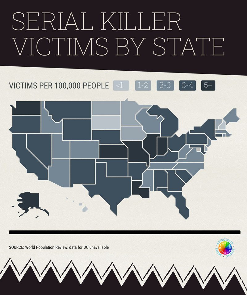 A recent analysis by World Population Review, which used FBI data and found that the highest number of serial killer victims per 100,000 residents in each state is Alaska, with just over 7 per 100,000. Louisiana, Kansas, Missouri, and Indiana round out the top five. So maybe not live there or just be very careful and selective in your dating.