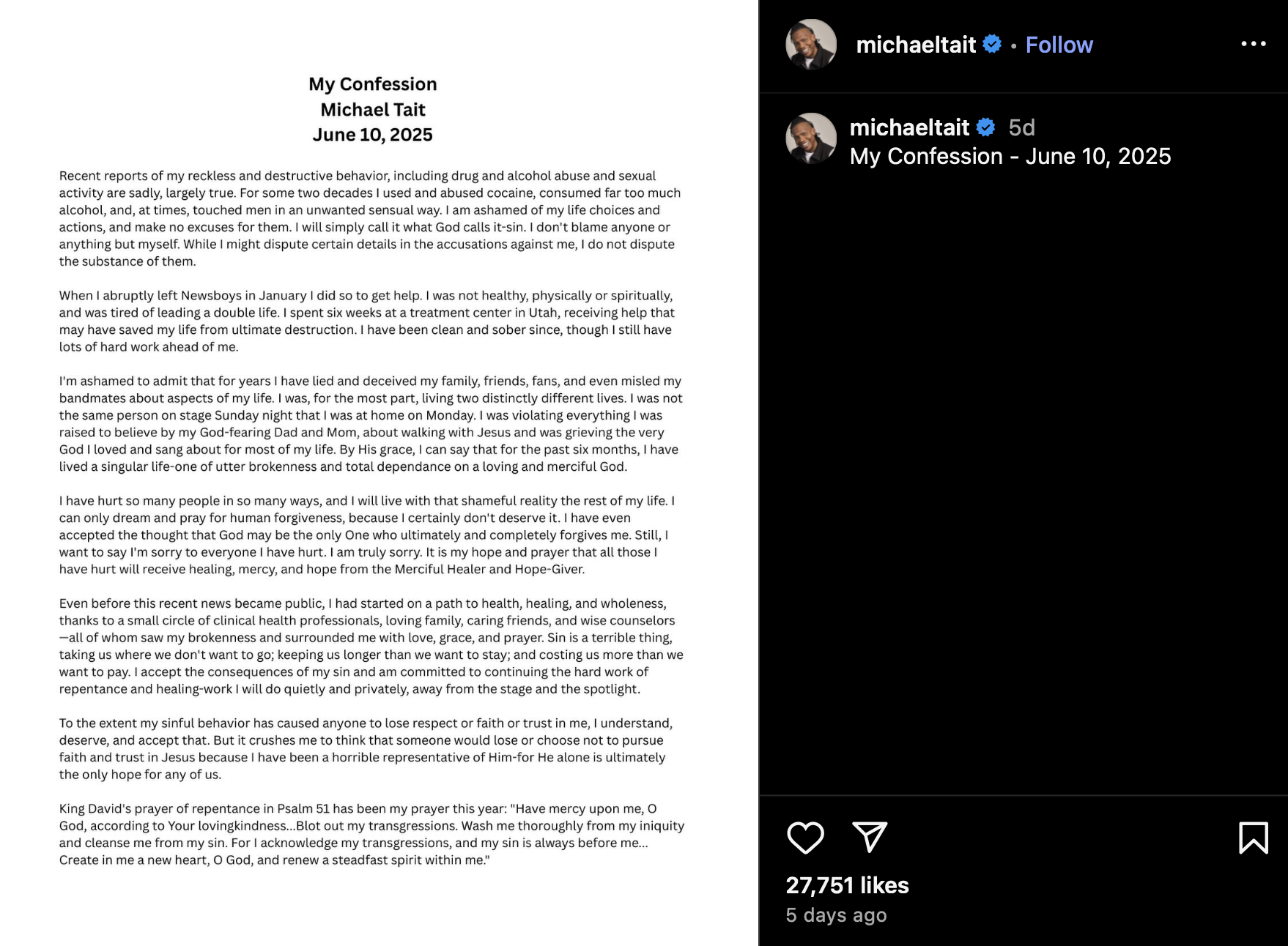 Tait responded publicly on June 10 with a lengthy confession posted to Instagram. In it, he admitted that “recent reports of my reckless and destructive behavior, including drug and alcohol abuse and sexual activity are sadly, largely true.” He described his past actions as “sin,” acknowledged he had lived a double life for years, and expressed shame and regret — though he stopped short of directly naming or addressing the specific accusations.