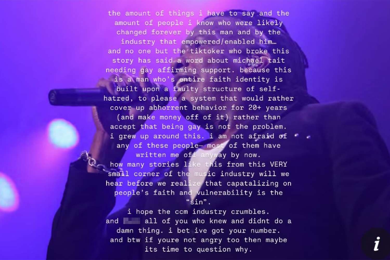 “The amount of things I have to say,” Williams began, “and the amount of people I know who were likely changed forever by this man and by the industry that empowered/enabled him…” She went on to condemn not just Tait, but the silence of those around him, writing, “I hope the CCM industry crumbles.”