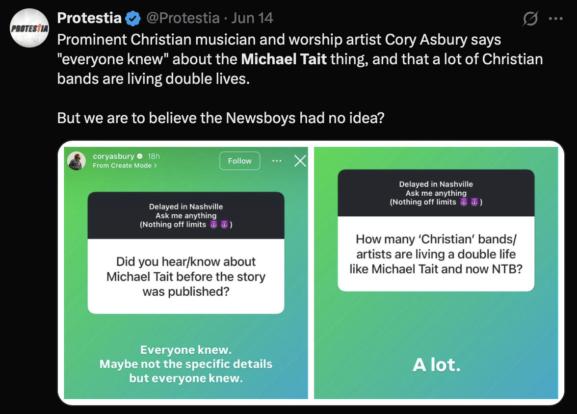 “No one but the TikToker who broke this story has said a word about Michael Tait needing gay-affirming support,” she wrote. “This is a man whose entire faith identity is built upon a faulty structure of self-hatred, to please a system that would rather cover up abhorrent behavior for 20+ years than accept that being gay is not the problem.”