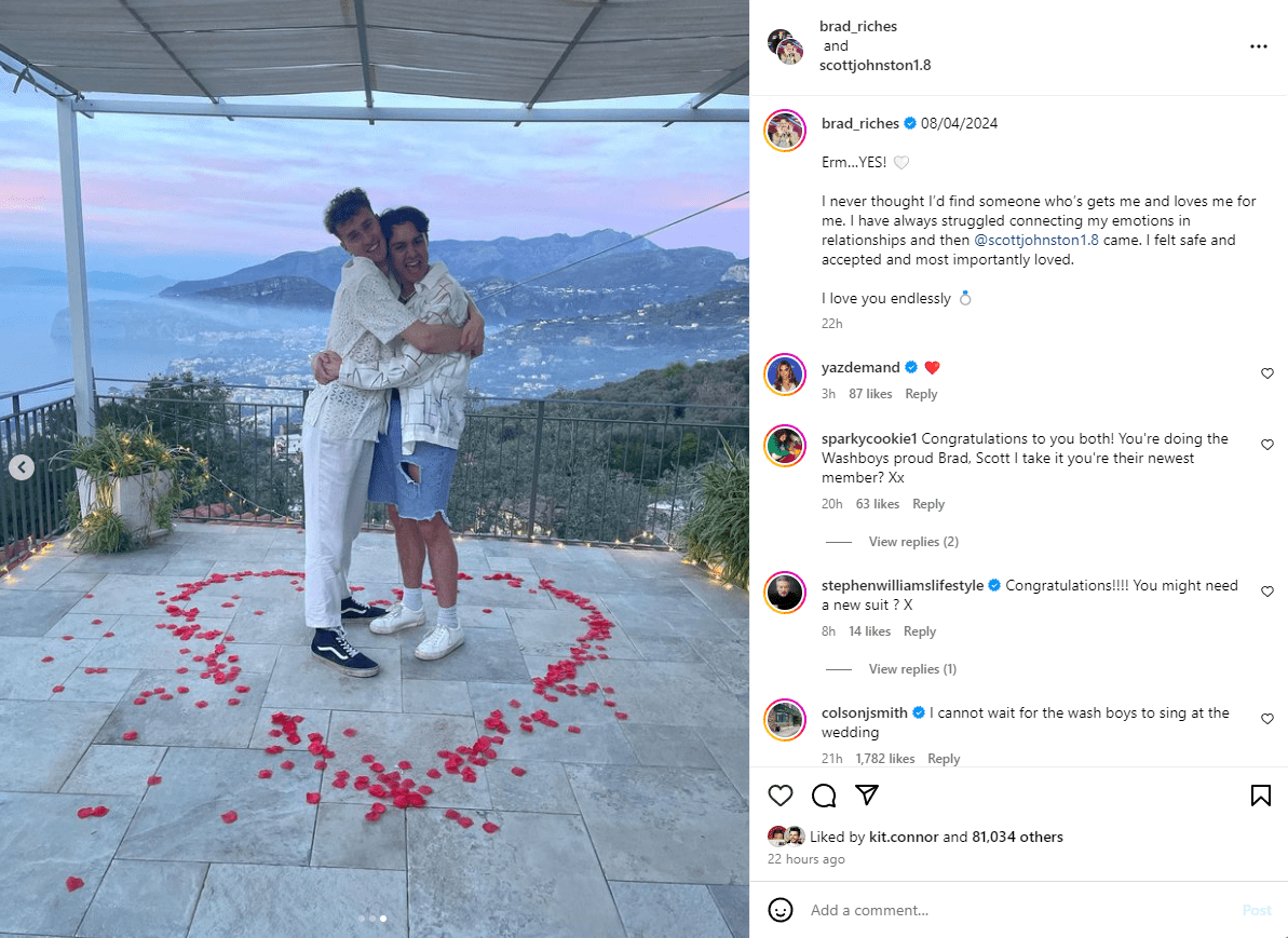 It’s a beautiful moment of celebration for Bradley and Scott, marking the beginning of an exciting new chapter in their lives together. As they embark on this journey towards marriage, they are surrounded by the love and support of friends, family, and fans alike.