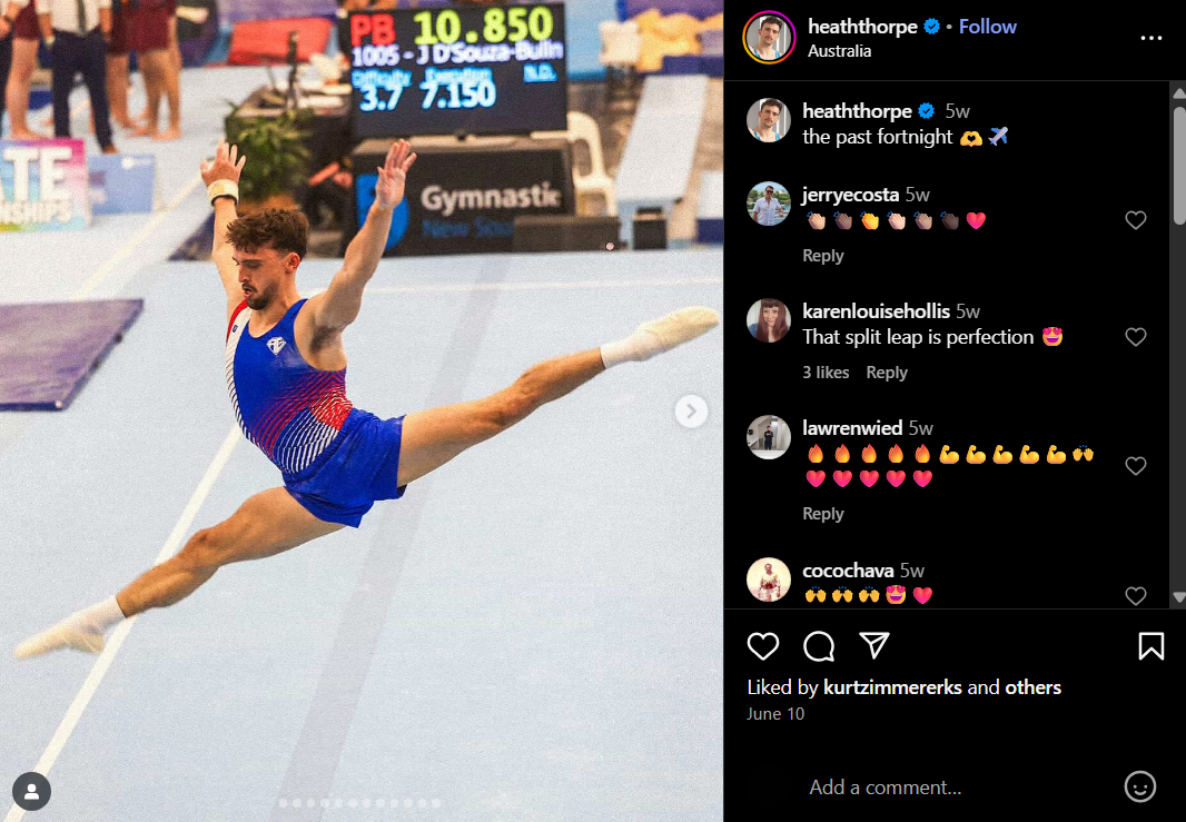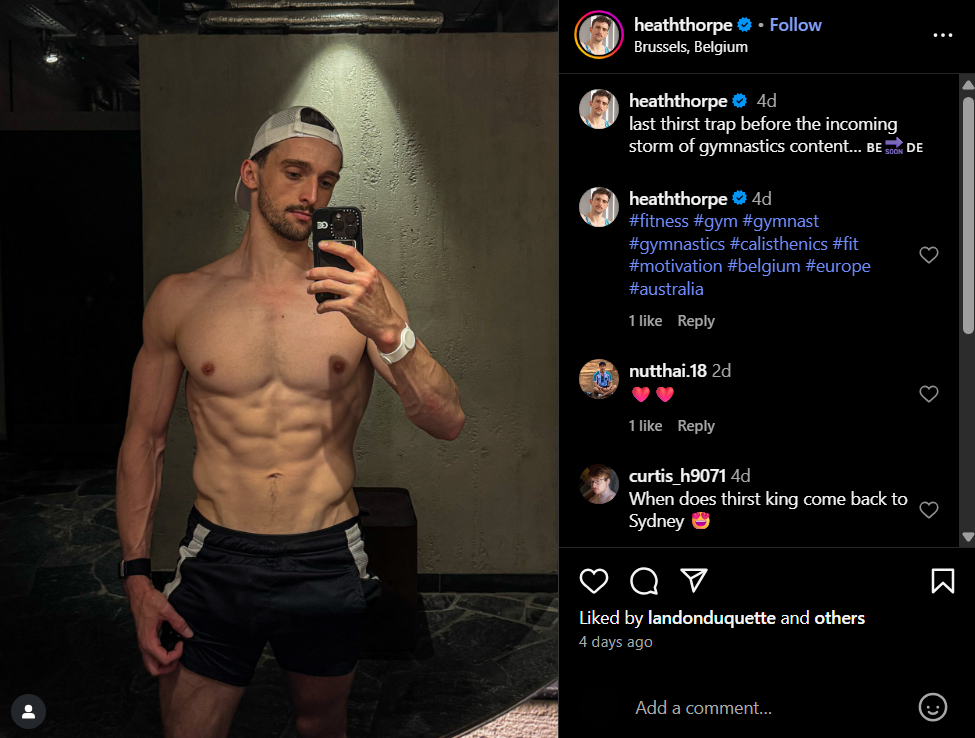 Let’s face it: calling Heath Thorpe’s posts “thirst traps” is almost an understatement. Sure, there’s the signature beachside shots in his speedos, but even his most “athletic” shots—like those gravity-defying moments on the high bar or showing off his impeccable flexibility—end up making fans swoon.