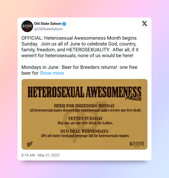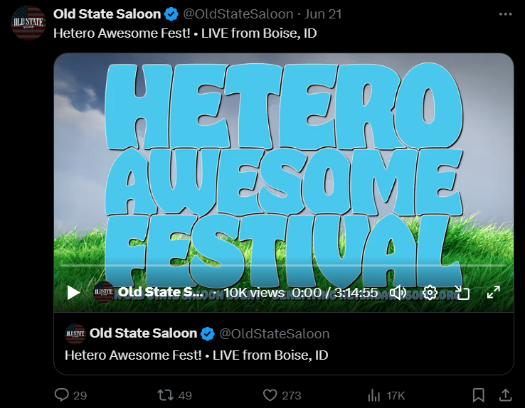 Sadly, this kind of messaging is nothing new for Fitzpatrick. His Eagle-based bar, the Old State Saloon, has built a reputation for hosting eyebrow-raising events like “Beers for Breeders” nights, flat-earth meetups, Christian singles mixers, and trivia nights where the grand prize is — wait for it — an AR-15. It’s giving Duck Dynasty cosplay meets Facebook conspiracy uncle. And last June, in a move that somehow manages to be both tone-deaf and desperate, Fitzpatrick declared the entire month “Heterosexual Awesomeness Month” — because apparently the other eleven weren’t providing enough straight airtime.