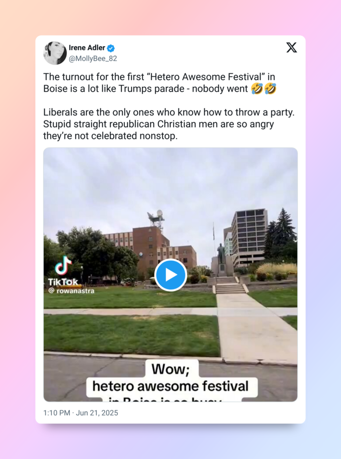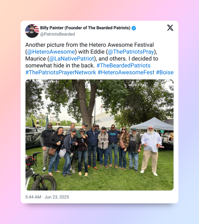 For all the noise, Hetero Awesome Fest came and went with barely a ripple — no public sponsors, no endorsements, no notable community figures. It was giving “local Facebook group meetup” more than “movement.” Boise Pride and Canyon County Pride declined to comment beforehand, but still extended well wishes to the organizers. Because let’s be honest: grace under pressure? That’s peak queer-coded excellence.