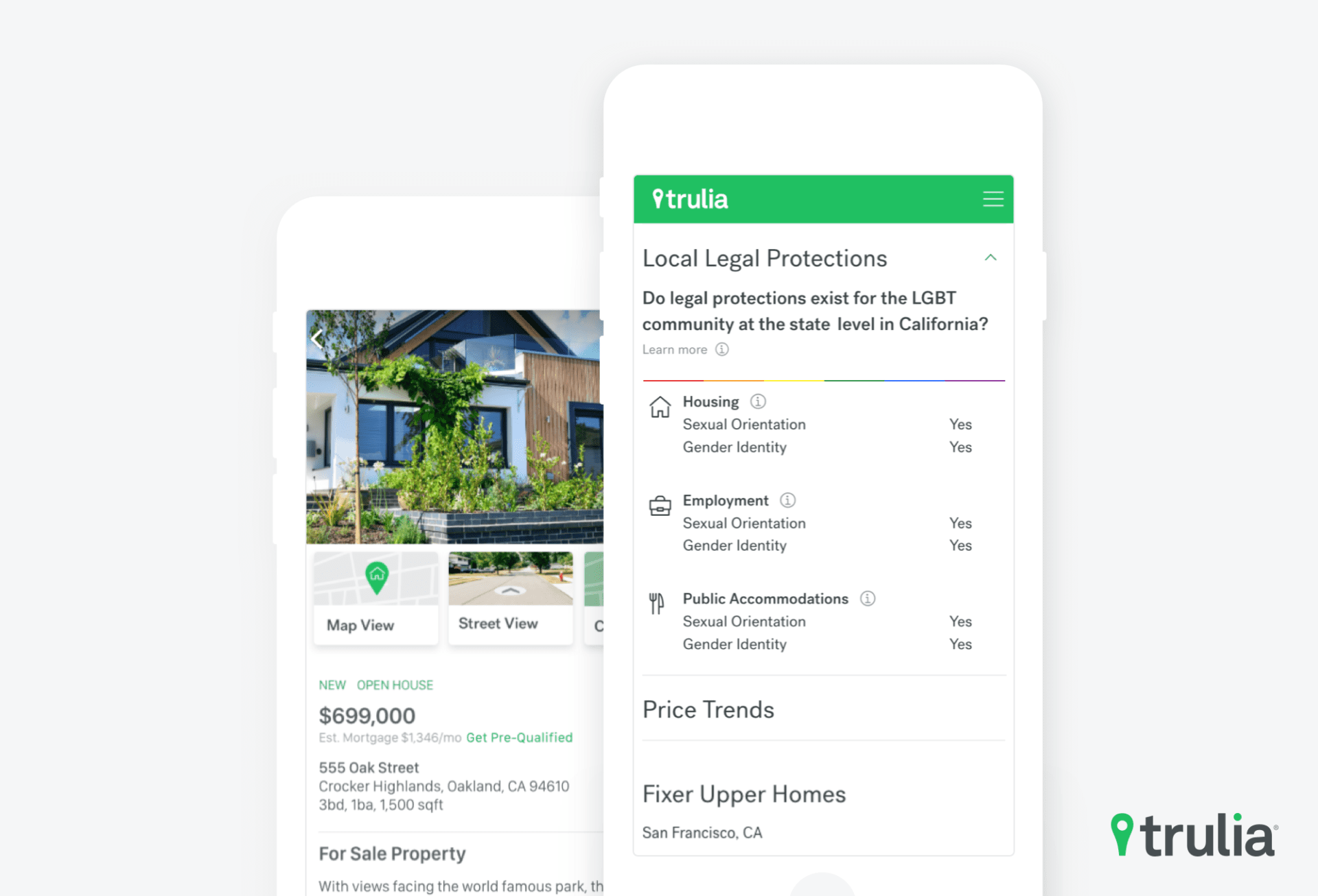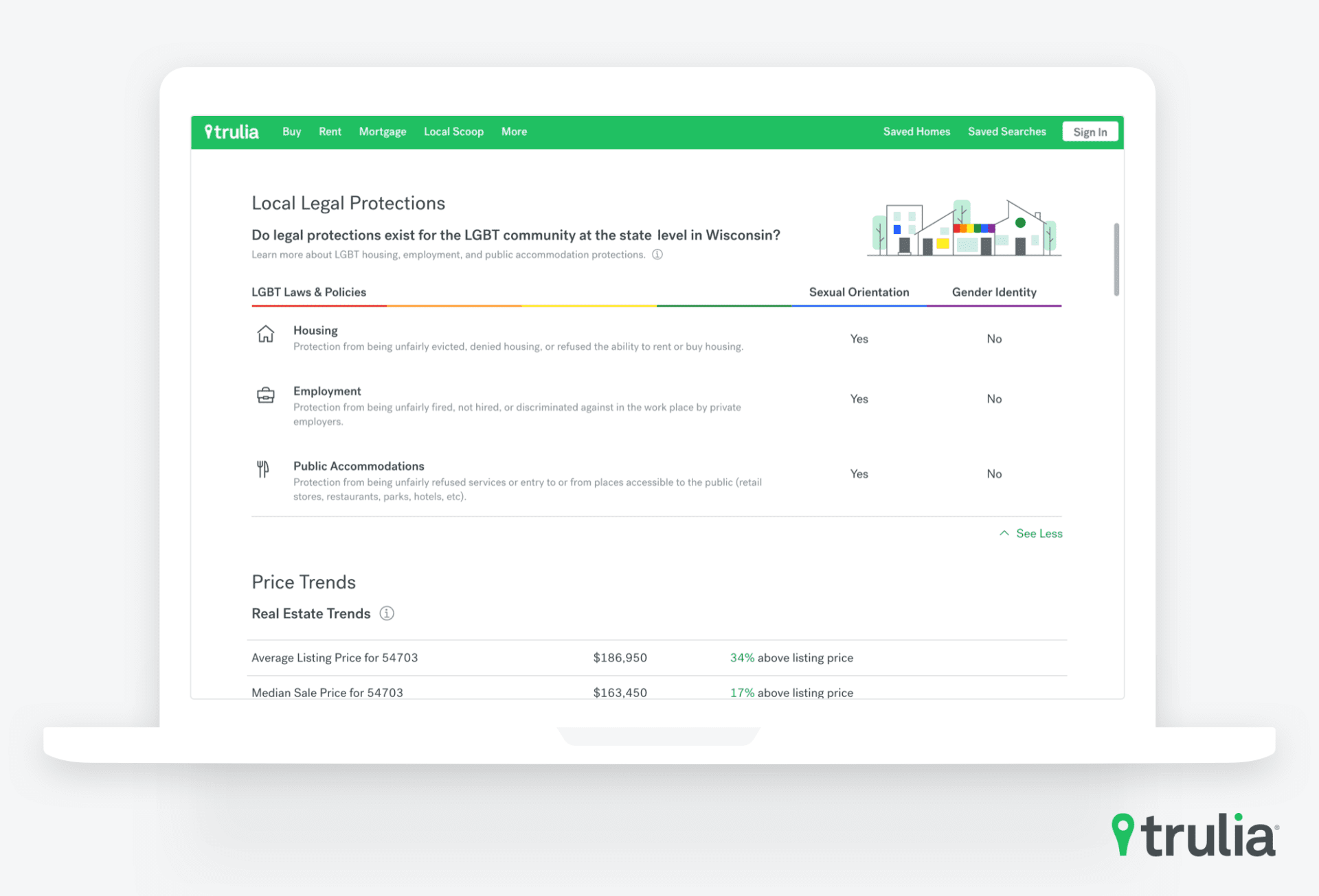 Trulia builds products that are designed to help you discover a place you’ll love to live. We regularly introduce new tools to help on this journey, and we’re launching an important one today: Local Legal Protections: The Local Legal Protections feature, an employee-led idea, helps homebuyers understand the non-discrimination laws that exist for the LGBT community in the jurisdiction of any prospective home.