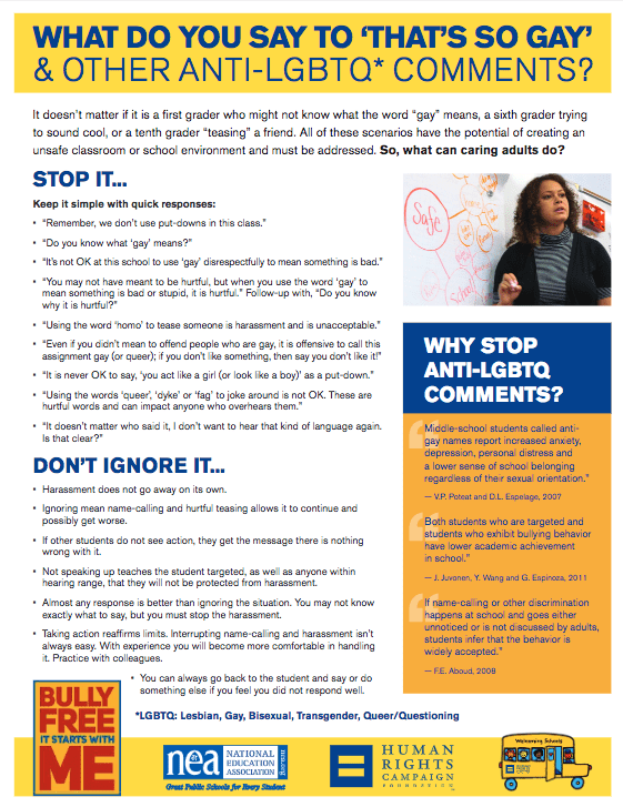 Someone knew we needed help. There's a new handout developed in partnership between the National Education Association (NEA) and the Human Rights Campaign Foundation and their projects: NEA BullyFree, Time to THRIVE and Welcoming SchoolsHow To Stop Anti Gay and LGBTQ Comments is a new pamphlet and downloadable PDF to help adults deal with the simplicity of anti-LGBTQ speech.