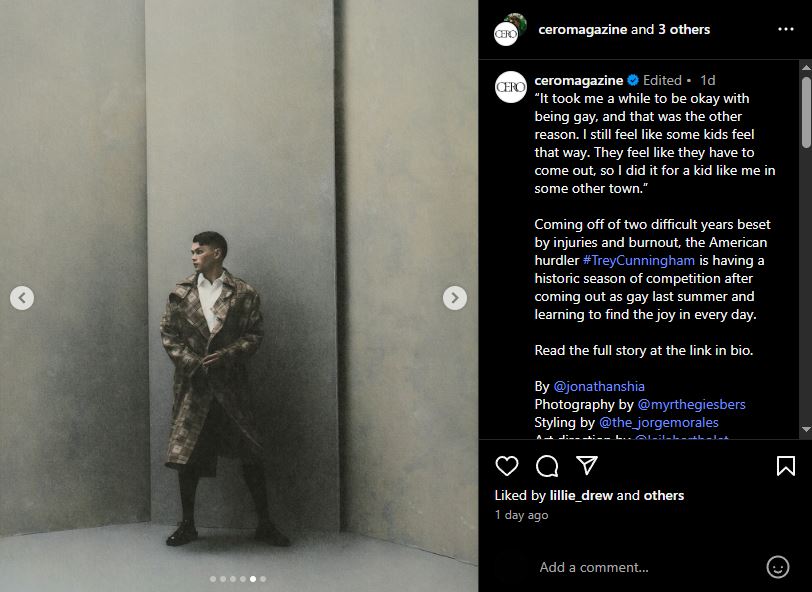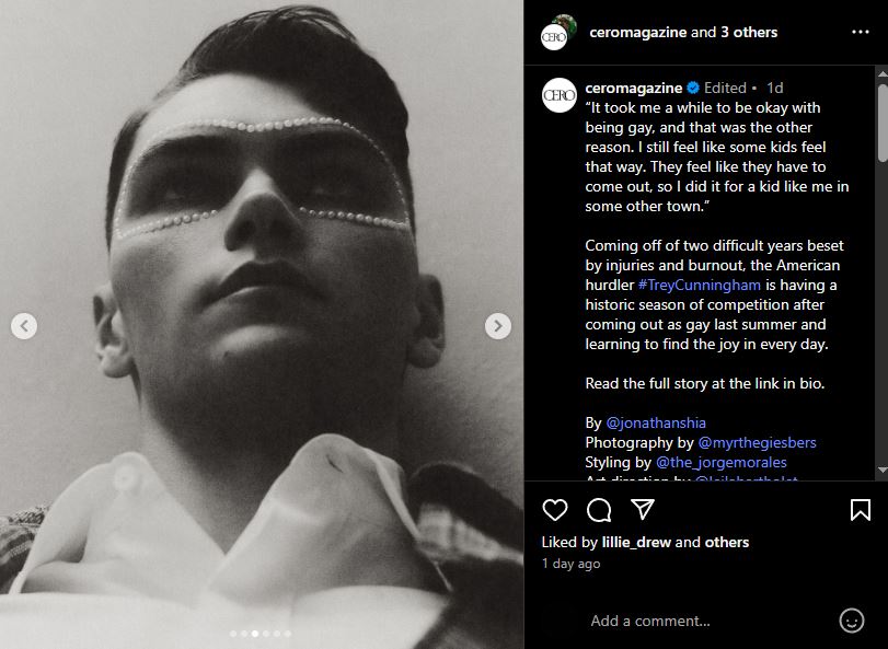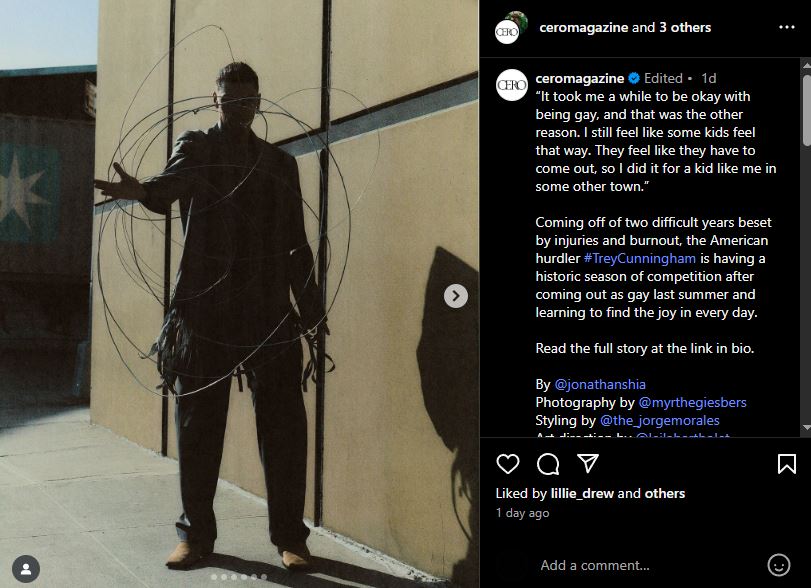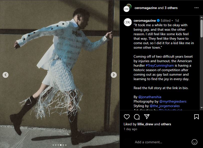 Representation matters. Not just in the wins, but in the witness. Cunningham knows that a young kid might see his name in headlines, or his photo in a magazine spread, and recognize a possibility: that greatness and queerness can walk—no, sprint—the same path.