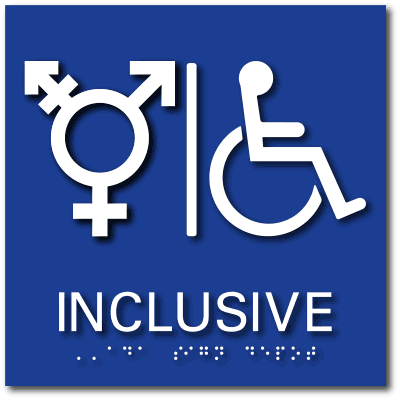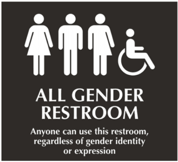 The sign does not state that there are three different bathrooms for these three different individuals, but instead hangs over one facility for use by men and women of all sexual persuasions. It is distinguished from another toilet at the establishment, which is wheelchair accessible.