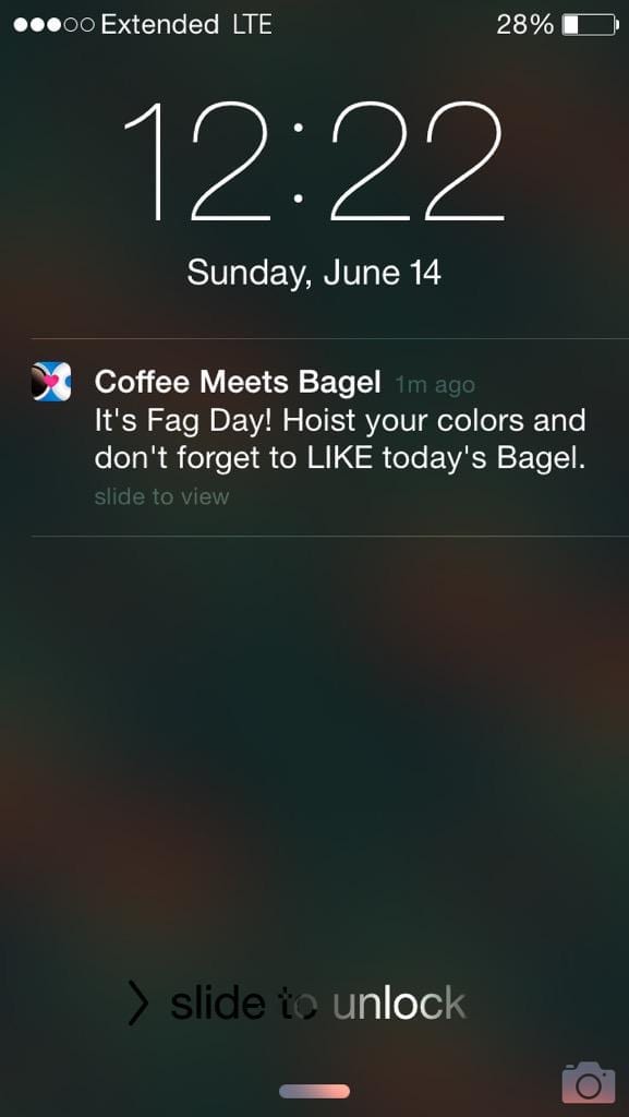Thanks for the well wishes "Coffee Meets Bagel" and happy Fag Day to you, too!