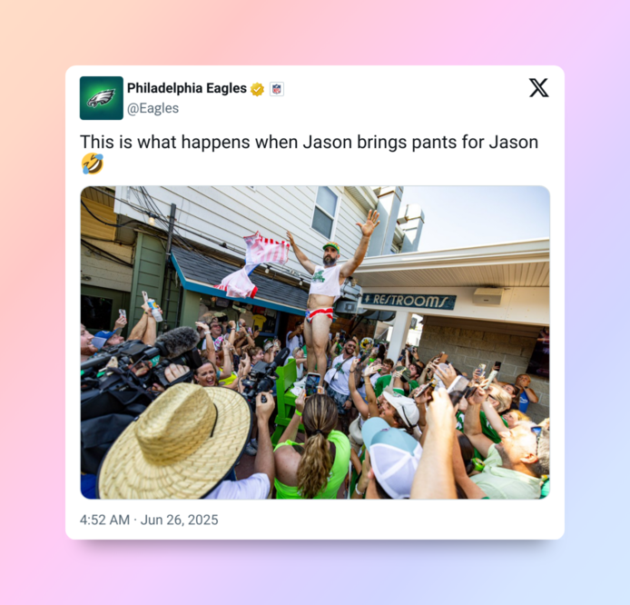 It’s giving “Magic Mike: Eagles Edition.” It’s giving “Bear Week meets Special Teams.” It’s giving “we stan an emotionally available jock who shows up for the community, even if he forgets his pants.”