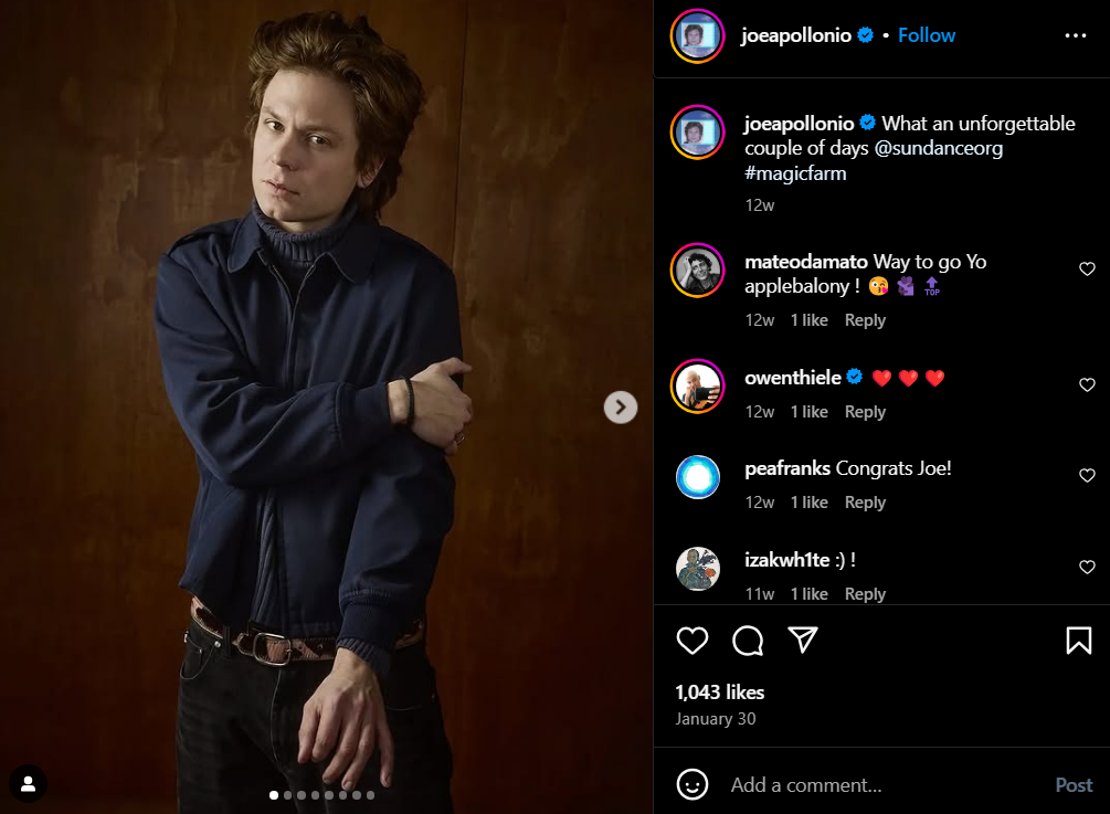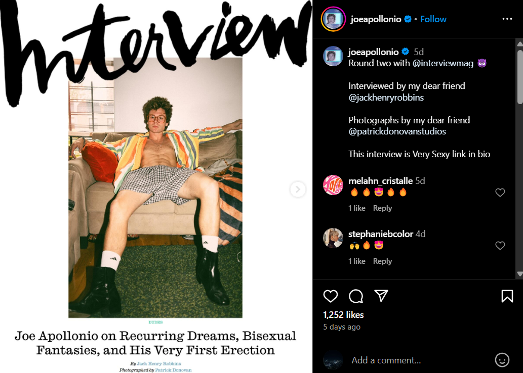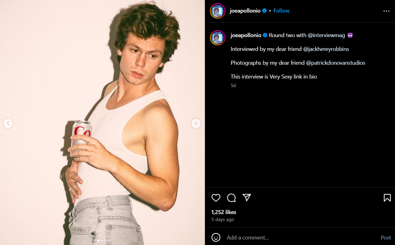 Joe Apollonio, in an interview with Interview Magazine just shows how he’s the kind of actor who could wax poetic about glyphosate and then immediately confess his first erection was from watching Stone Cold Steve Austin. In a world of pre-packaged, publicist-approved celebs, Apollonio is a refreshingly unfiltered breath of fresh air. He’s the guy who can casually drop “I’m so much smarter than people think, I just look stupid” and have you laughing while questioning your own life choices. With his unapologetic honesty, Apollonio weaves through his career with the kind of ease that comes only when you’ve spent years not giving a damn about conventional expectations.