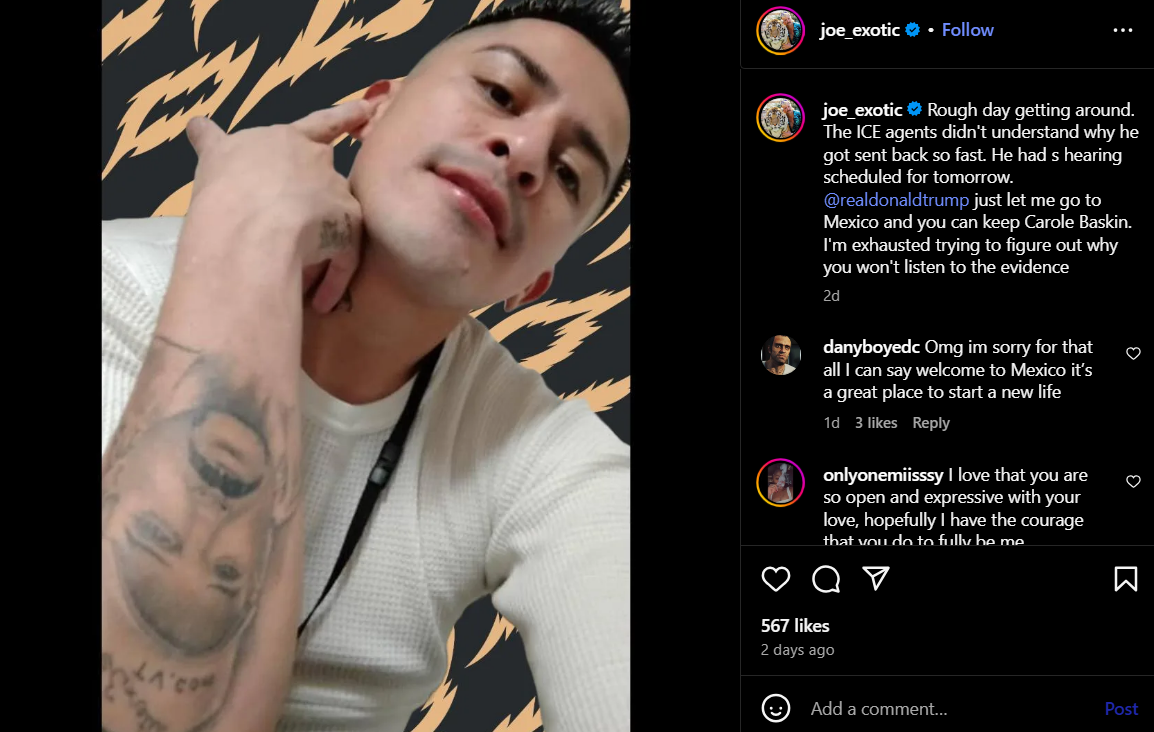 “Rough day getting around. The ICE agents didn’t understand why he got sent back so fast,” Joe posted on Instagram, sounding more like a tired pop diva than a convicted felon. “He had a hearing scheduled for tomorrow. @realdonaldtrump just let me go to Mexico and you can keep Carole Baskin.”