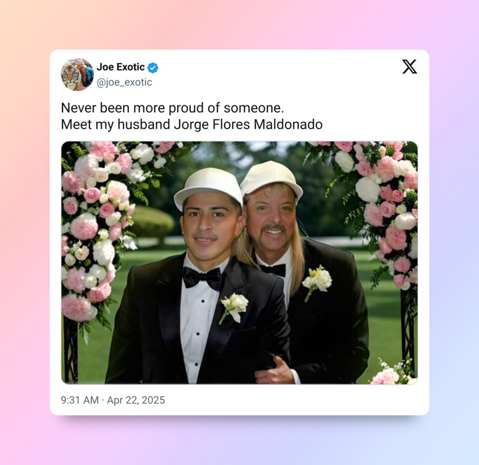 Even from prison, Joe’s melodrama manages to captivate. He’s out here posting emotional pleas, tagging presidents, and publicly grieving a marriage that’s now divided by a border wall. It’s part heartbreak, part reality TV epilogue — and somehow, it’s all just… very gay. Not in a rainbow-flag, parade kind of way, but in the raw, messy, passion-fueled camp way. The kind of love story that ends not with “happily ever after,” but with one of you being deported before brunch.