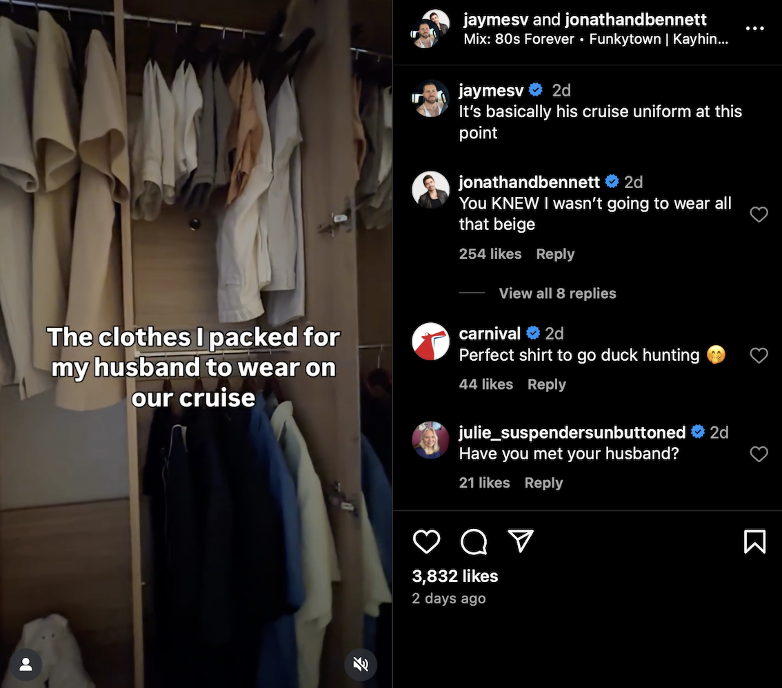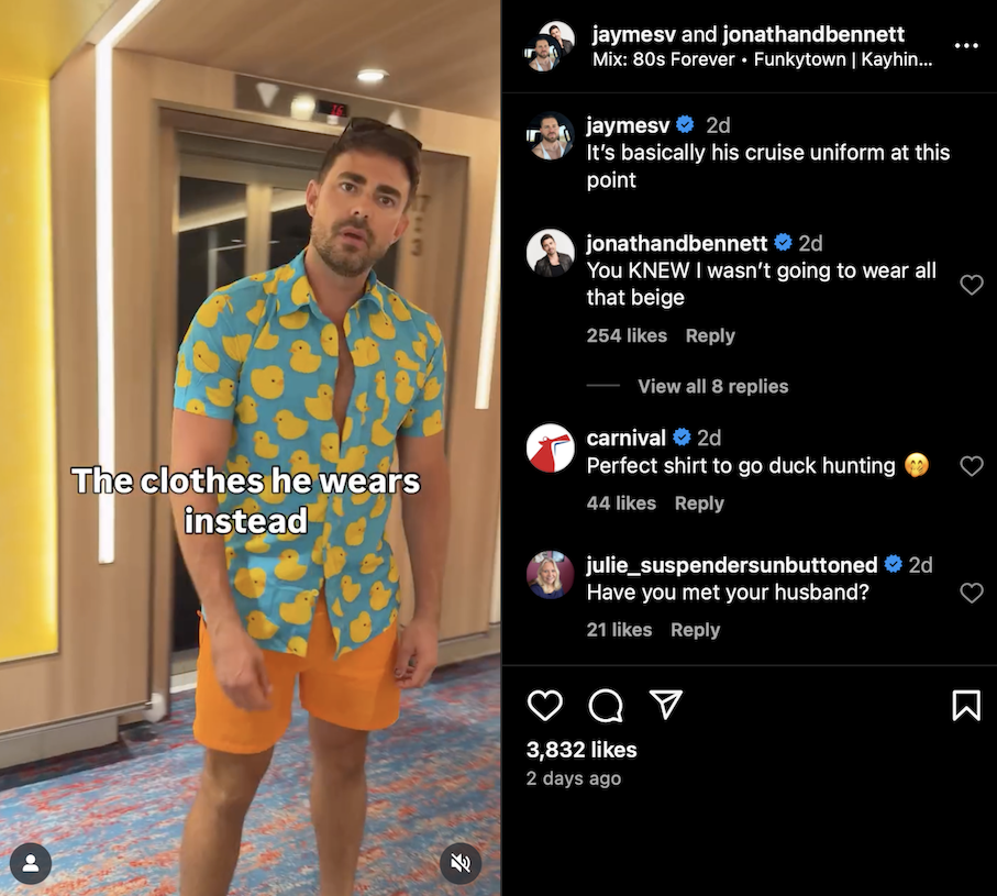 Jaymes’ reaction? A mix of resigned amusement and pure love. After all, what’s a vacation without a little fashion rebellion? He even dubbed it Jonathan’s “cruise uniform,” which honestly, feels right. Jonathan might just be pioneering a new wave of maritime style—call it nauti-cute.
