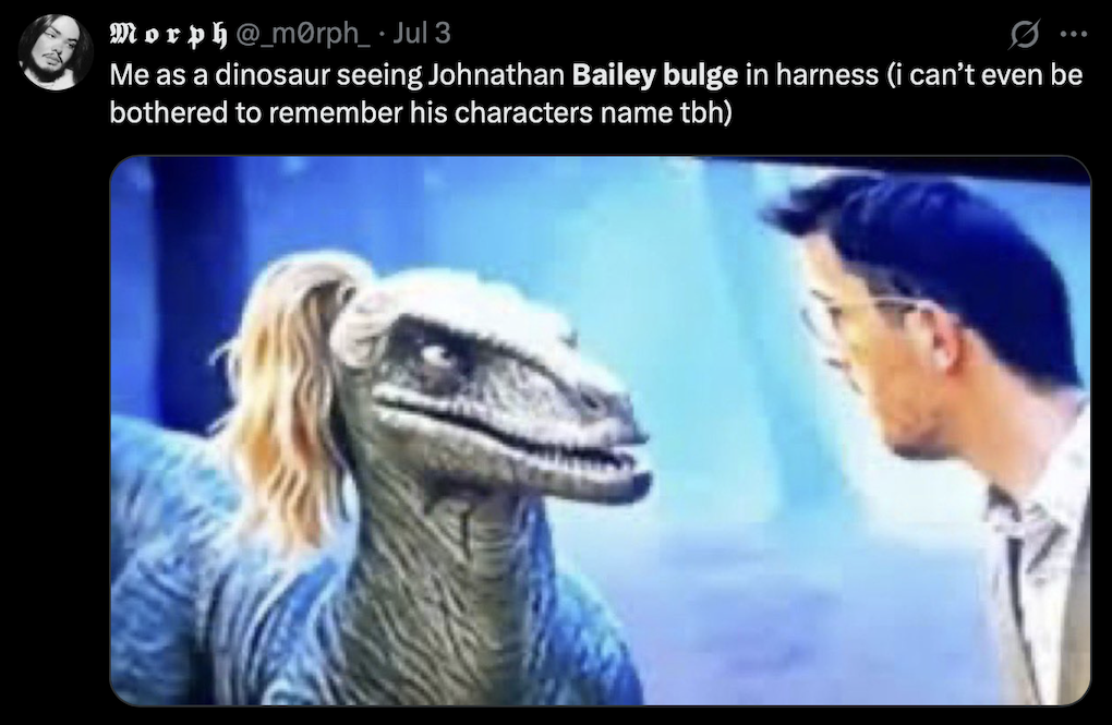 - “just watched the new Jurassic World movie and where tf were all the dinosaurs?? best part of the movie was Jonathan Bailey’s bulge”