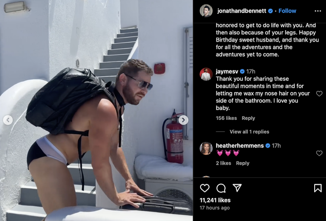 Let’s start with the visuals. Jonathan shared a scroll-stopping series of videos on Instagram that had fans screaming, “I want what they have… and also Jaymes’ legs.” From clips of Jaymes working out in the teeniest of short shorts (his thighs deserve their own IMDb page, tbh), to footage of him being the kind of husband rom-coms are written about—carrying all their beach vacation luggage down a flight of stairs in nothing but swim briefs. That’s right. Just briefs. A literal dreamboat with a suitcase in each hand. Someone give this man a trophy for multitasking and serving.