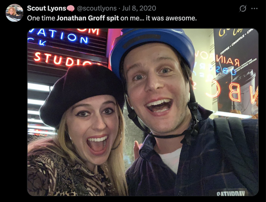 The topic came up again during the lie detector test when Groff was asked his secret to staying so hydrated. “I get wet when I—” he begins, before Daniel and Lindsay cut him off with matching cries of “No, no!” What followed was a full comedy sketch of Groff attempting to clarify that he just drinks water. (Eventually.)