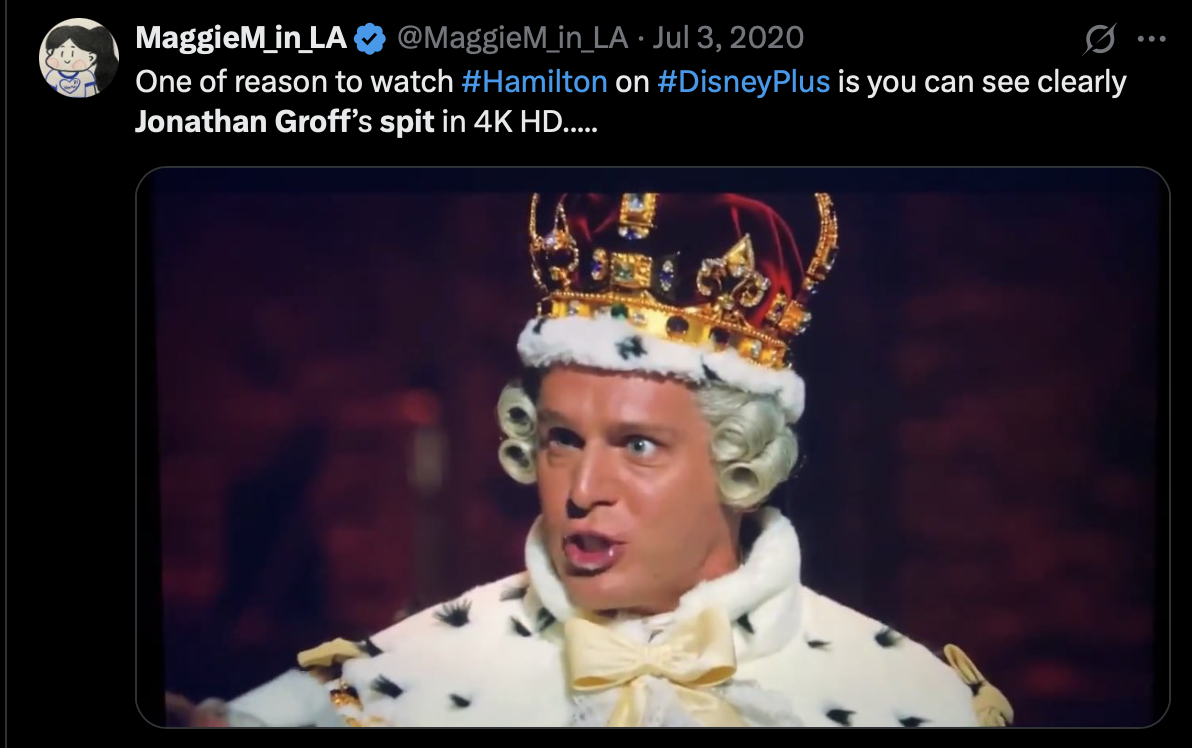 This, of course, isn’t news to Hamilton fans who witnessed Groff’s truly iconic reign as King George III, where his performance was made extra memorable thanks to the—you guessed it—very visible flying droplets mid-monologue. It wasn’t just acting. It was precipitation. It was passion. It was pure Broadway hydration.