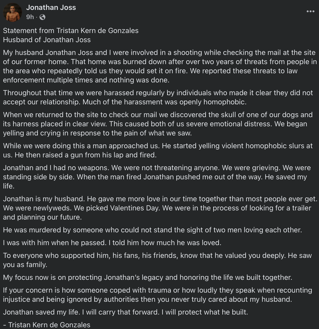 “We began yelling and crying in response to the pain of what we saw,” Tristan said. “While we were doing this, a man approached us. He started yelling violent homophobic slurs at us. He then raised a gun from his lap and fired.” Tristan claimed Joss saved his life by pushing him out of the way.