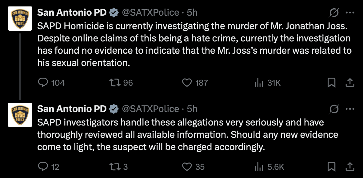 The San Antonio Police Department, however, has publicly stated that there is currently “no evidence to indicate that Mr. Joss’s murder was related to his sexual orientation.” The statement posted to X (formerly Twitter) emphasized that SAPD investigators “handle these allegations very seriously” and will reclassify the charges if new evidence supports a hate crime motive.