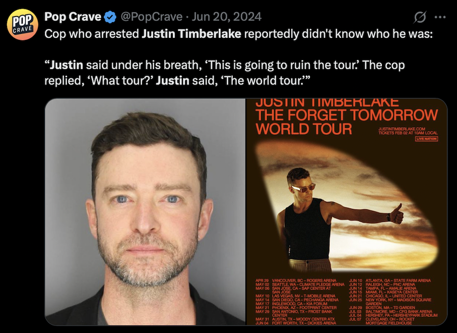 This all comes on the heels of Timberlake’s now-infamous DWI arrest in Sag Harbor last year, where he reportedly told the arresting officer, “This is going to ruin the tour.” The officer, famously unimpressed, responded, “What tour?” Ouch. Turns out the “world tour” was very real—and now, thanks to TikTok, so is the backlash.
