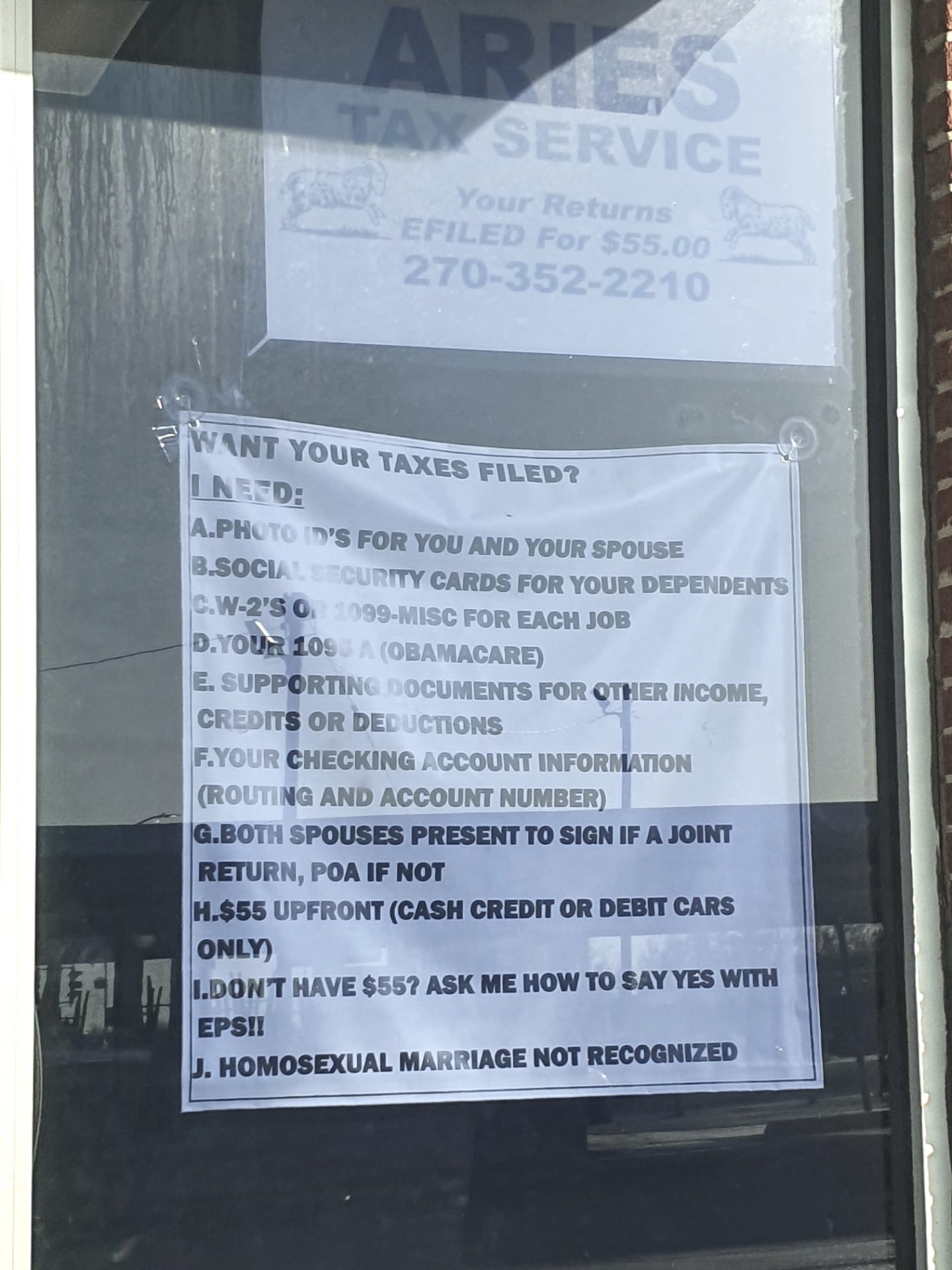 Located in Hardin County, Kentucky, Radcliff is over 40 miles southwest of Louisville and has a population of over 22,000 people. According to the city’s website, it is due to Radcliff being adjacent to the United States Army base, Fort Knox that the “community’s diversity derives. This fusion of cultures creates a unique level of understanding among citizens, facilitating collaboration and cooperation.” Yet married same-sex couples can be turned away from having their taxes done with a simple typed document with the words “Homosexual Marriage Not Recognized” used as a sign on the door of a business like Aries Tax Service.