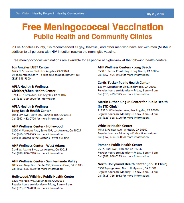 For more on this new meningitis outbreak as well as statistics about previous outbreaks, relationships with HIV-positive individuals, and vaccination recommendations as well as the chance to receive free vaccinations, head over to latimes.com .