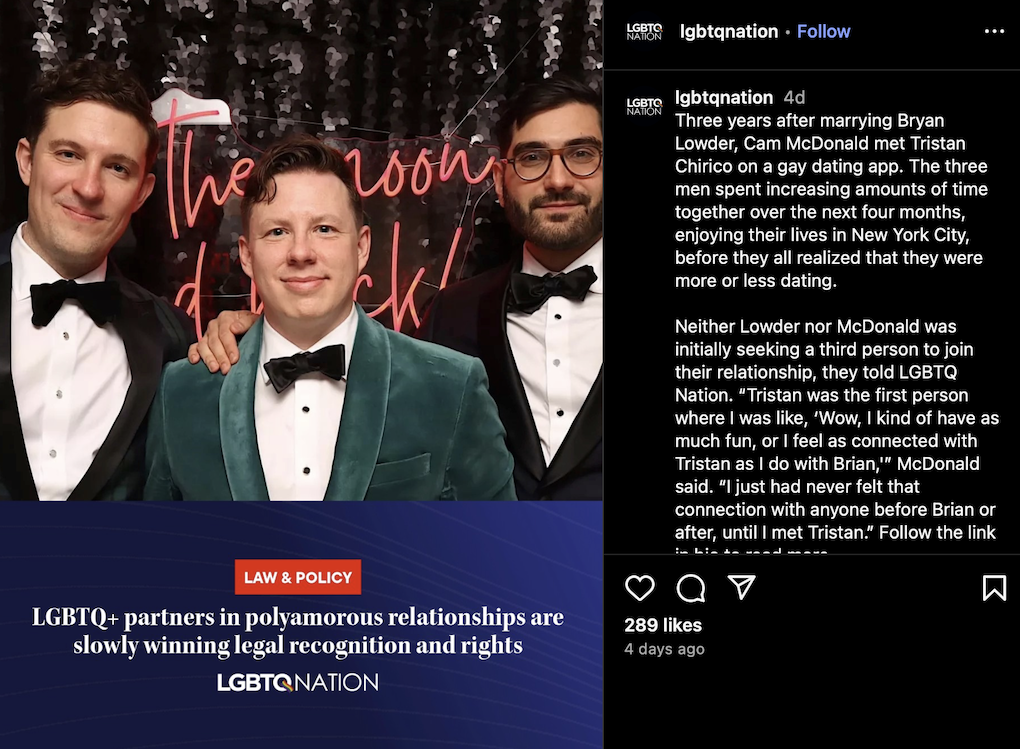 Cam McDonald and Bryan Lowder were already married when Cam met Tristan Chirico. It started off casual. Then fun. Then meaningful. Eventually, it became undeniable: they weren’t just friends—they were falling in love, all three of them. “I just had never felt that connection with anyone before Brian or after, until I met Tristan,” McDonald shared with LGBTQ Nation. The heart knows what it wants.